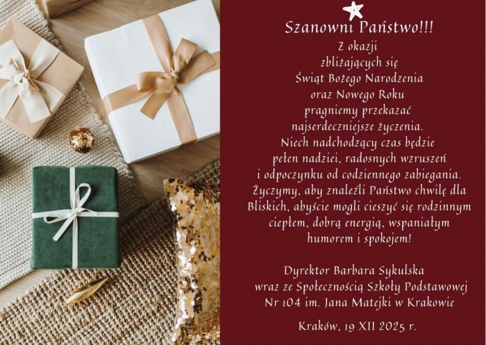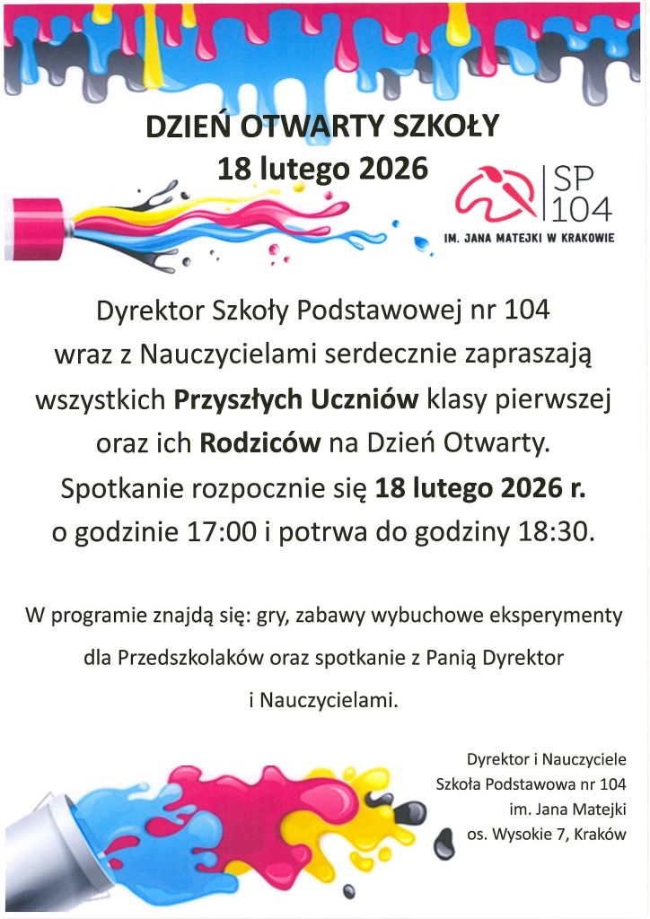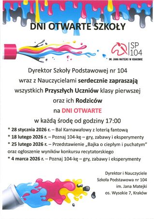 Szkoła Podstawowa nr 104 im. Jana Matejki w Krakowie mieści się w samodzielnym budynku, zabezpieczonym monitoringiem, położonym w bezpiecznym miejscu, w oddaleniu od ruchliwych ulic, w sąsiedztwie Plant Bieńczyckich.