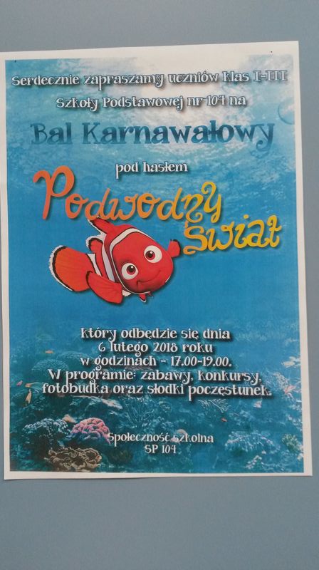 06 Lut 2018 Bal karnawałowy Wydarzenia / Aktualności Dnia 6 lutego odbył się w naszej szkole bal karnawałowy dla klas I-III oraz dla przedszkolaków pod hasłem "Podwodny świat". Oto fotorelacja: