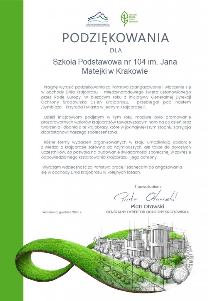 Nasza szkoła z dumą informuje, że otrzymała oficjalne podziękowanie od Generalnego Dyrektora Ochrony Środowiska za aktywny udział w ogólnopolskich obchodach Dnia Krajobrazu 2025, które w tym roku odbywały się pod hasłem „Symbioza – Przyroda i Miasto w jednym krajobrazie”.
