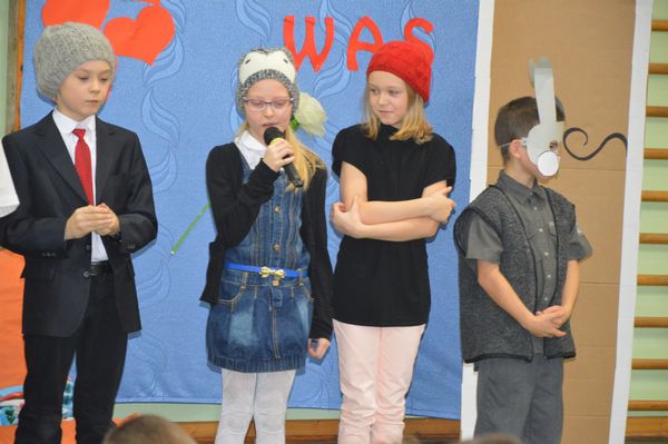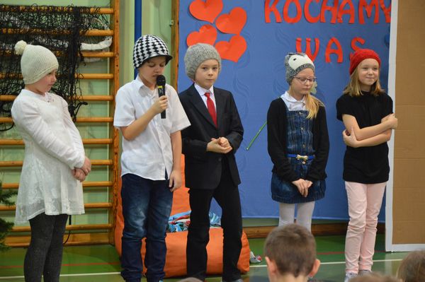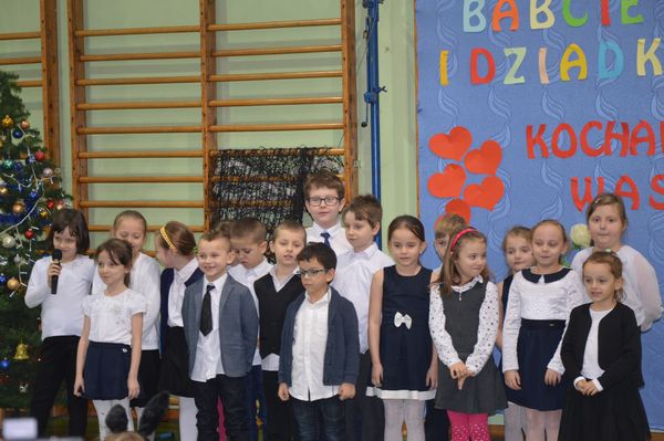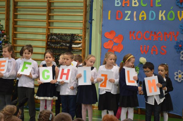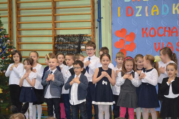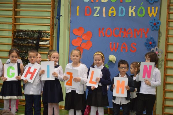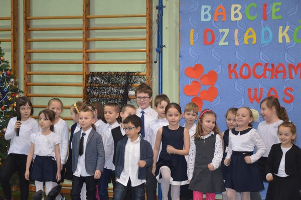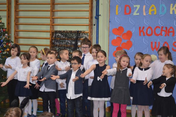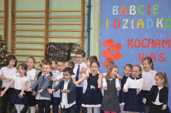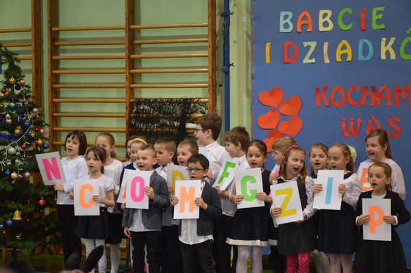 Dnia 20 stycznia obchodziliśmy w naszej szkole uroczystość z okazji Dnia Babci i Dziadka. Zaproszeni dziadkowie licznie przybyli, aby podziwiać występy swoich wnucząt. Uroczystość rozpoczęła Pani dyrektor Magdalena Hyla, która serdecznie przywitała wszystkich gości oraz wyrecytowała humorystyczny wierszyk z życzeniami dla dziadków. Następnie poszczególne klasy zaprezentowały krótkie programy artystyczne. Jako pierwsza wystąpiła klasa II a w przedstawieniu „Kopciuszek”, następnie klasa I a zaprezentowała piosenkę i krótkie wierszyki, klasa III b wystąpiła w przedstawieniu „Zielony Kapturek” oraz klasa III a zaśpiewała piosenkę oraz zaprezentowała przedstawienie „Czerwony Kapturek”. Wzruszenie naszych gości było ogromne, a gromkie brawa świadczyły o zadowoleniu i dumie ze swych wnuków. Po części artystycznej uczniowie zaprosili swe babcie oraz swych dziadziusiów do klas, gdzie czekał na nich słodki poczęstunek oraz własnoręcznie wykonane przez uczniów prezenty. W tym dniu wszystkie buzie były rozpromienione i radosne. Dziadkowie z dumą opuszczali mury szkolne.