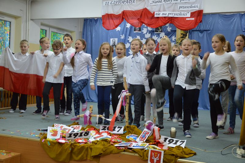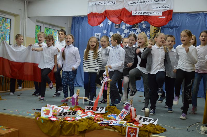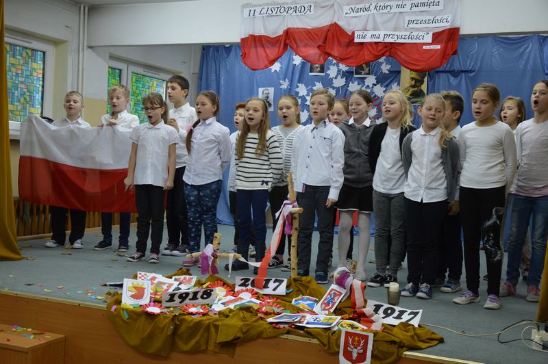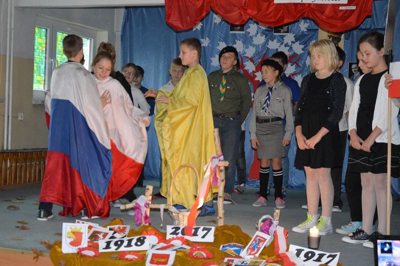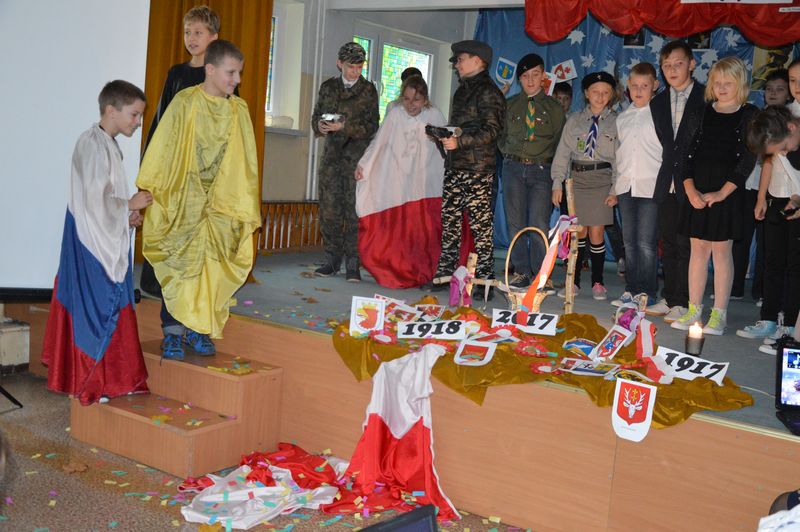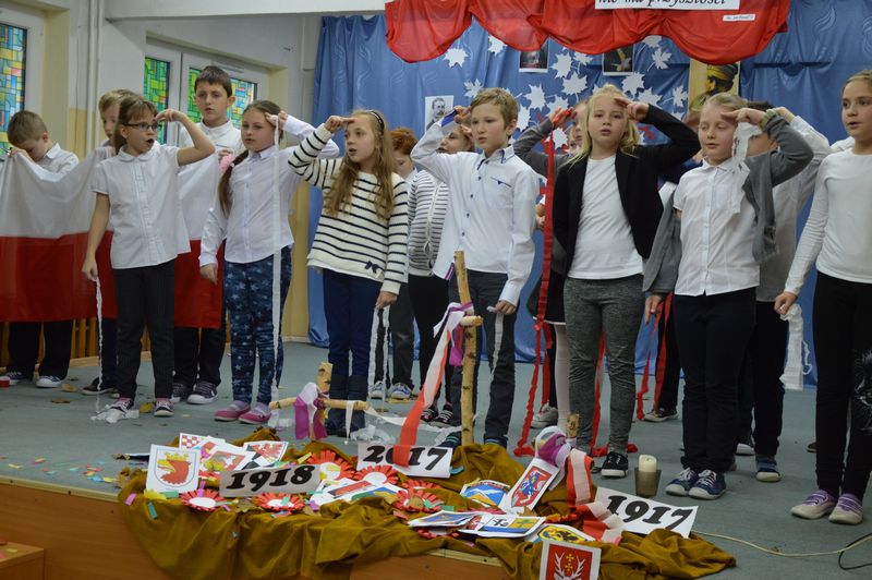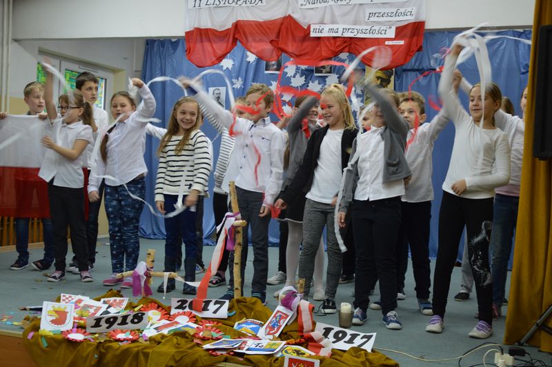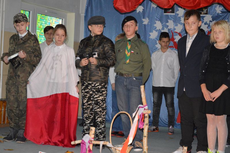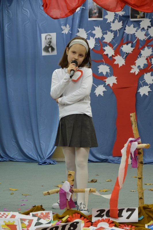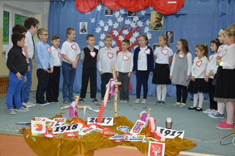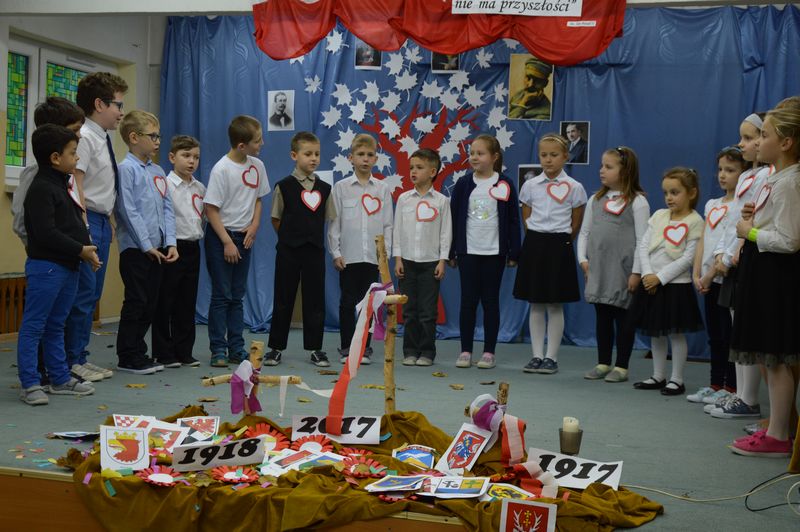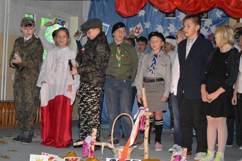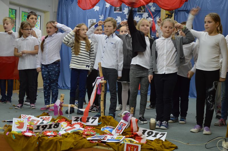 Dnia 10 listopada obchodziliśmy w naszej szkole Dzień Niepodległości. Klasa Va wraz z wychowawczynią panią Jolantą Krzyworzeką przygotowała piękną inscenizację z okazji 99 rocznicy odzyskania przez Polskę niepodległości. Podczas tej uroczystości przypomniane zostały nam dni 123 lat niewoli Polski, począwszy od dnia kiedy Polska jako niepodległe państwo przestała istnieć na mapie Europy, przez dzieje narodu polskiego w okresie zaborów, wypełnionego walką o wyzwolenie aż do dnia, w którym wzeszła jutrzenka wolności. Po krótkim występie uczniowie wspólnie zaśpiewali pieśni patriotyczne, m.in; Pierwsza Brygada, O mój Rozmarynie, Wojenko, wojenko, Rota, Pierwsza Kadrowa, które przypomniały nam, jak ważna dla Polaka jest wolność i ojczyzna.