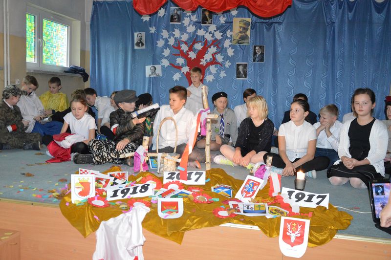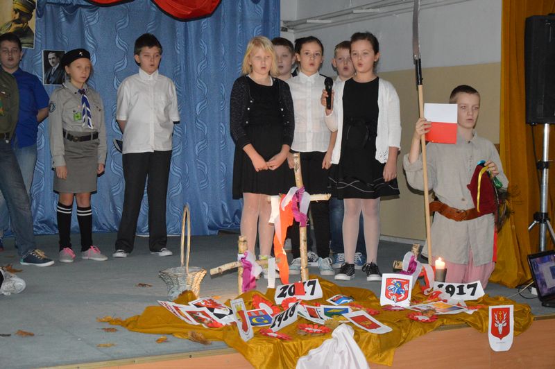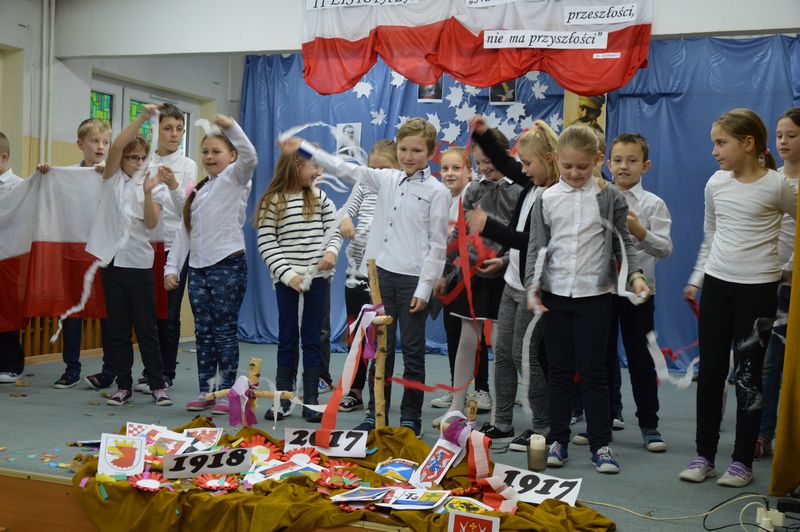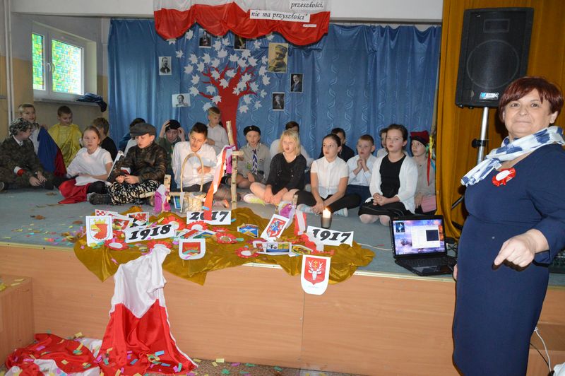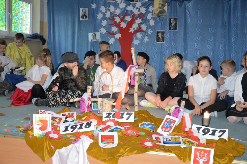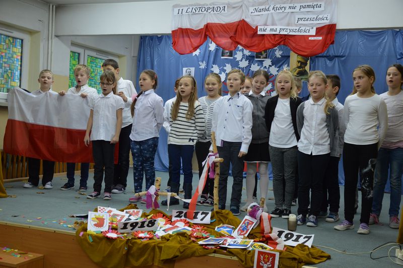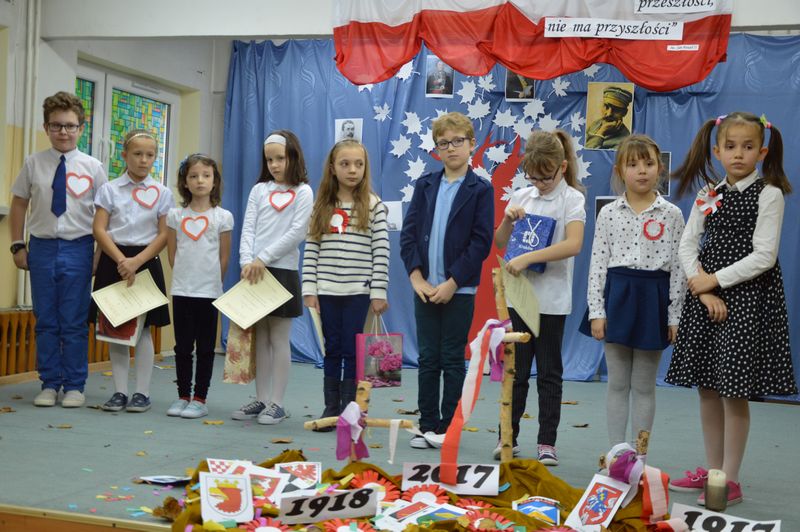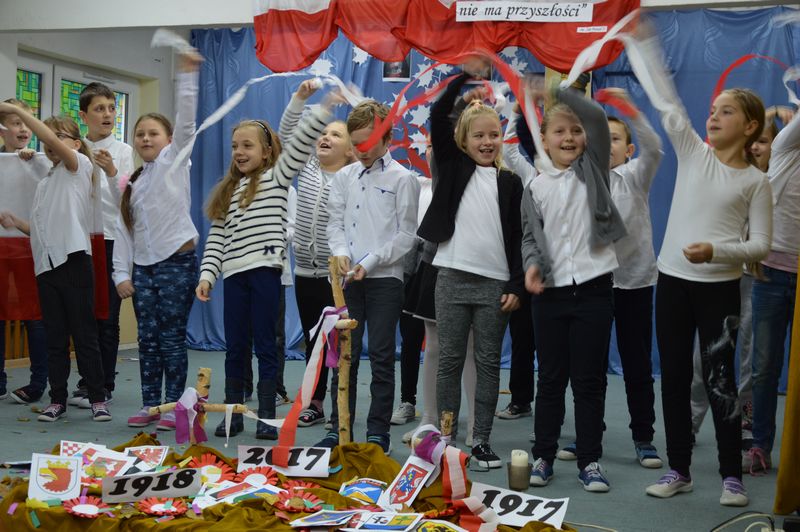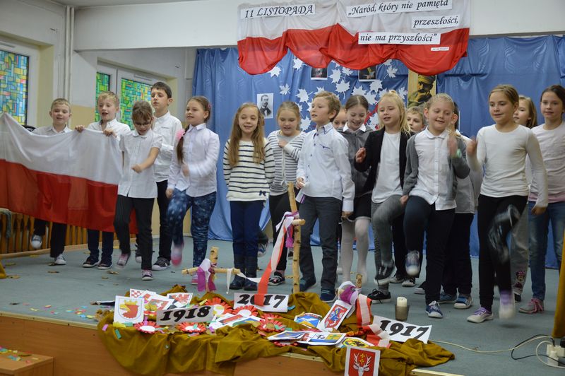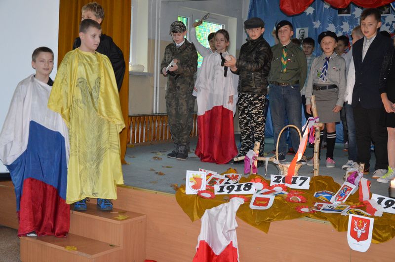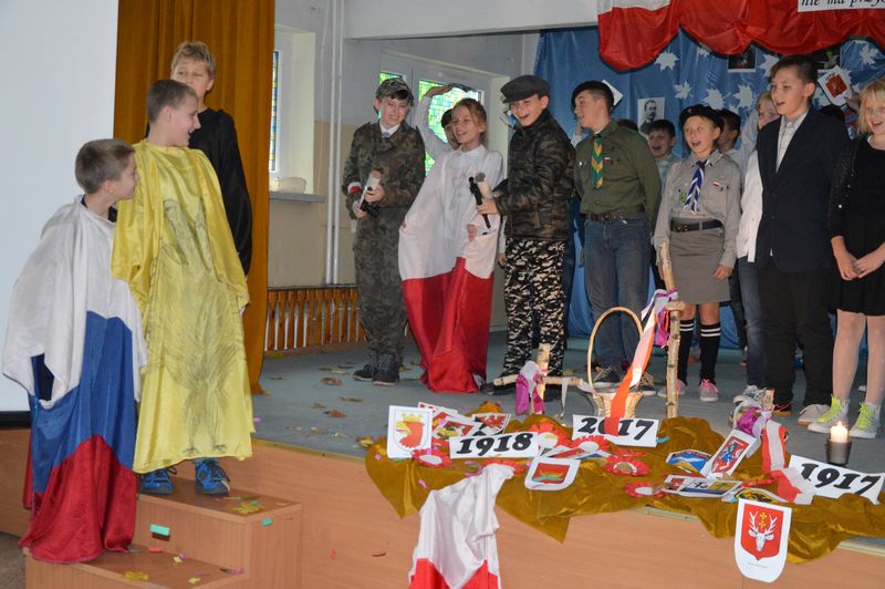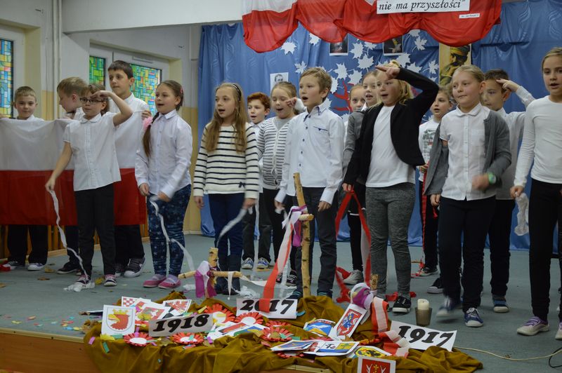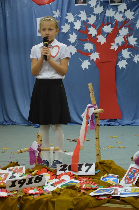 Dnia 10 listopada obchodziliśmy w naszej szkole Dzień Niepodległości. Klasa Va wraz z wychowawczynią panią Jolantą Krzyworzeką przygotowała piękną inscenizację z okazji 99 rocznicy odzyskania przez Polskę niepodległości. Podczas tej uroczystości przypomniane zostały nam dni 123 lat niewoli Polski, począwszy od dnia kiedy Polska jako niepodległe państwo przestała istnieć na mapie Europy, przez dzieje narodu polskiego w okresie zaborów, wypełnionego walką o wyzwolenie aż do dnia, w którym wzeszła jutrzenka wolności. Po krótkim występie uczniowie wspólnie zaśpiewali pieśni patriotyczne, m.in; Pierwsza Brygada, O mój Rozmarynie, Wojenko, wojenko, Rota, Pierwsza Kadrowa, które przypomniały nam, jak ważna dla Polaka jest wolność i ojczyzna.