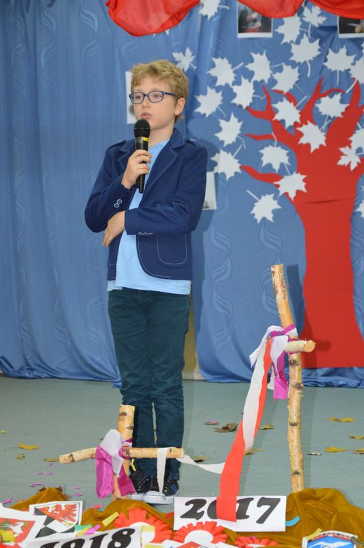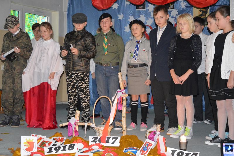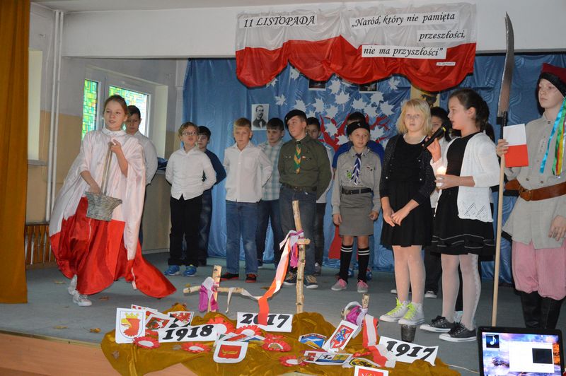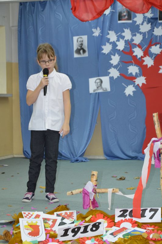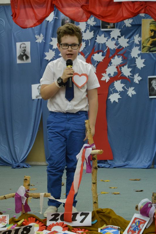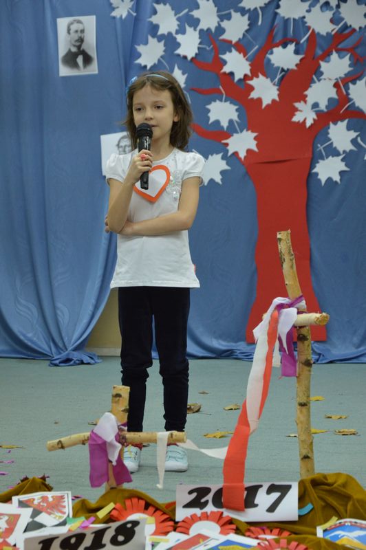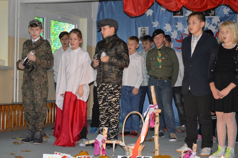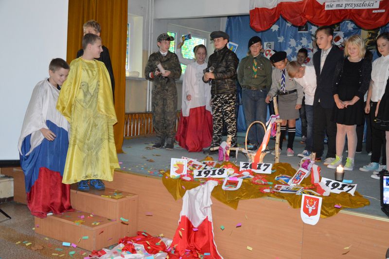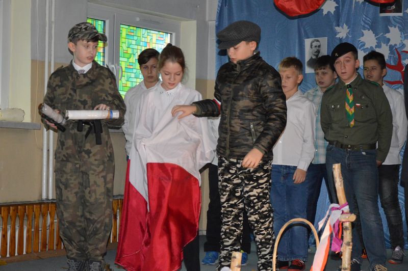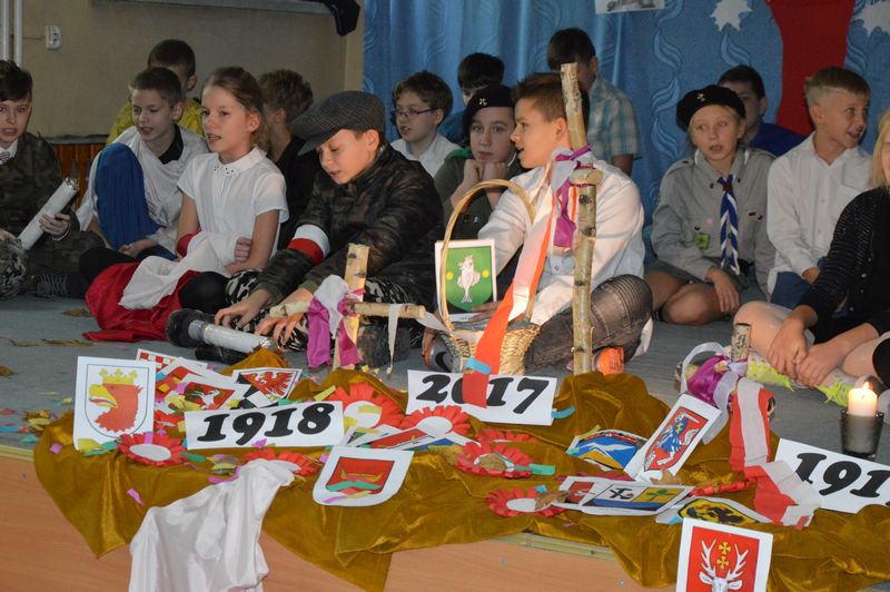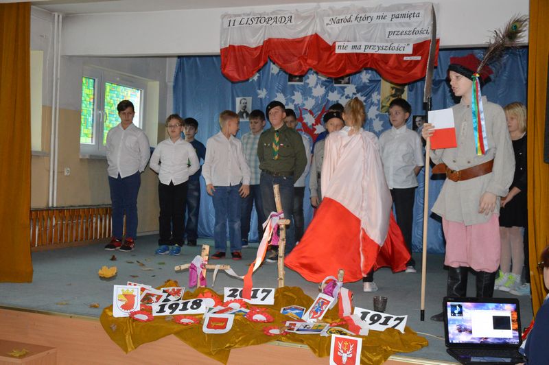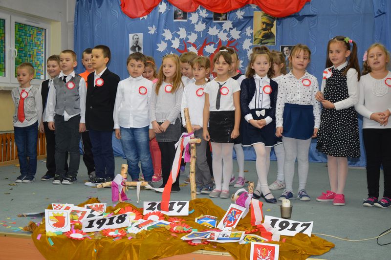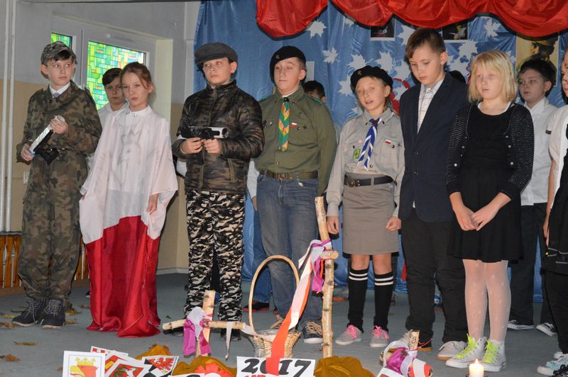 Dnia 10 listopada obchodziliśmy w naszej szkole Dzień Niepodległości. Klasa Va wraz z wychowawczynią panią Jolantą Krzyworzeką przygotowała piękną inscenizację z okazji 99 rocznicy odzyskania przez Polskę niepodległości. Podczas tej uroczystości przypomniane zostały nam dni 123 lat niewoli Polski, począwszy od dnia kiedy Polska jako niepodległe państwo przestała istnieć na mapie Europy, przez dzieje narodu polskiego w okresie zaborów, wypełnionego walką o wyzwolenie aż do dnia, w którym wzeszła jutrzenka wolności. Po krótkim występie uczniowie wspólnie zaśpiewali pieśni patriotyczne, m.in; Pierwsza Brygada, O mój Rozmarynie, Wojenko, wojenko, Rota, Pierwsza Kadrowa, które przypomniały nam, jak ważna dla Polaka jest wolność i ojczyzna.