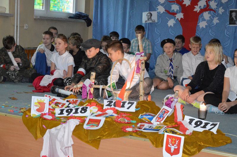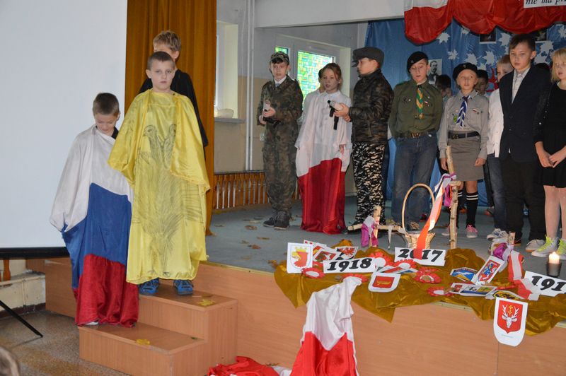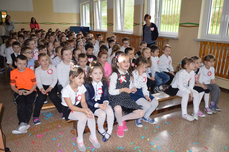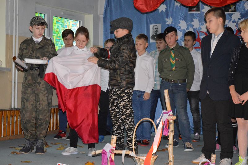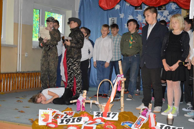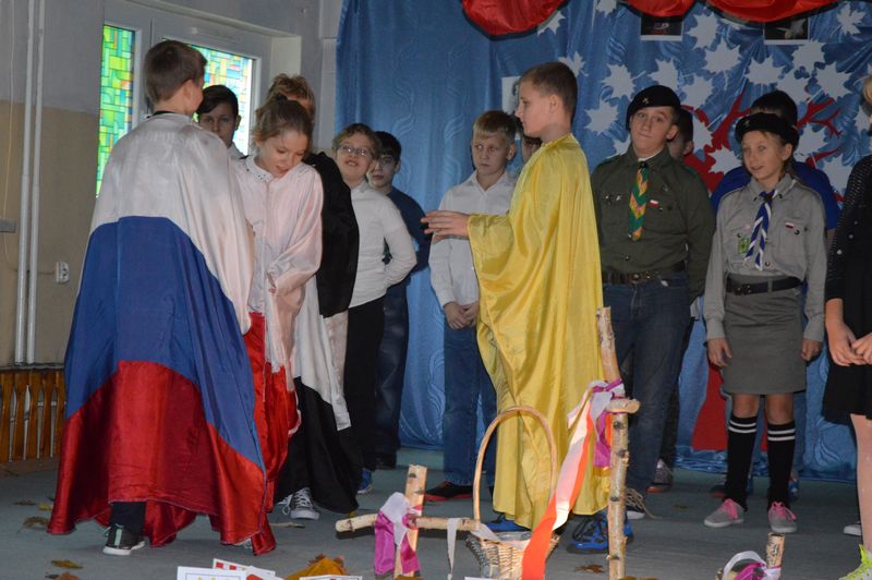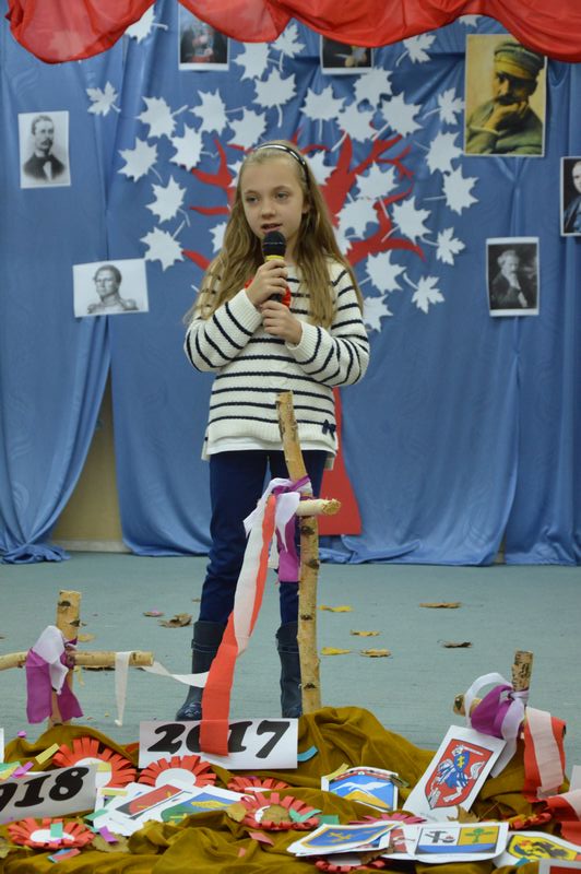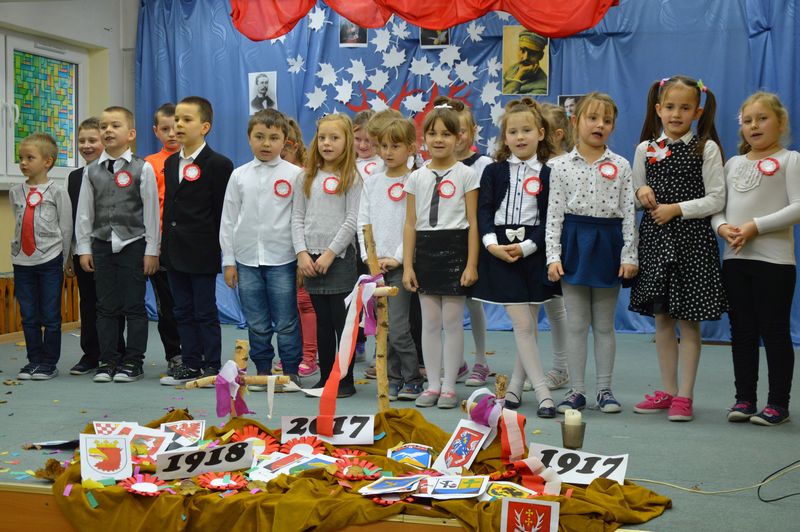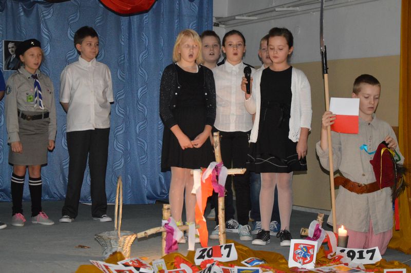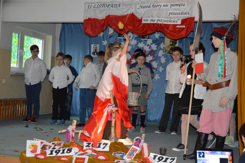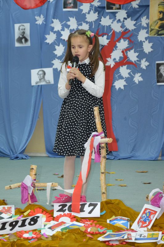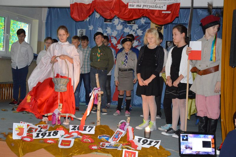 Dnia 10 listopada obchodziliśmy w naszej szkole Dzień Niepodległości. Klasa Va wraz z wychowawczynią panią Jolantą Krzyworzeką przygotowała piękną inscenizację z okazji 99 rocznicy odzyskania przez Polskę niepodległości. Podczas tej uroczystości przypomniane zostały nam dni 123 lat niewoli Polski, począwszy od dnia kiedy Polska jako niepodległe państwo przestała istnieć na mapie Europy, przez dzieje narodu polskiego w okresie zaborów, wypełnionego walką o wyzwolenie aż do dnia, w którym wzeszła jutrzenka wolności. Po krótkim występie uczniowie wspólnie zaśpiewali pieśni patriotyczne, m.in; Pierwsza Brygada, O mój Rozmarynie, Wojenko, wojenko, Rota, Pierwsza Kadrowa, które przypomniały nam, jak ważna dla Polaka jest wolność i ojczyzna.