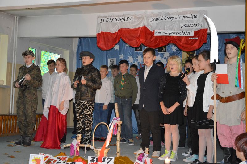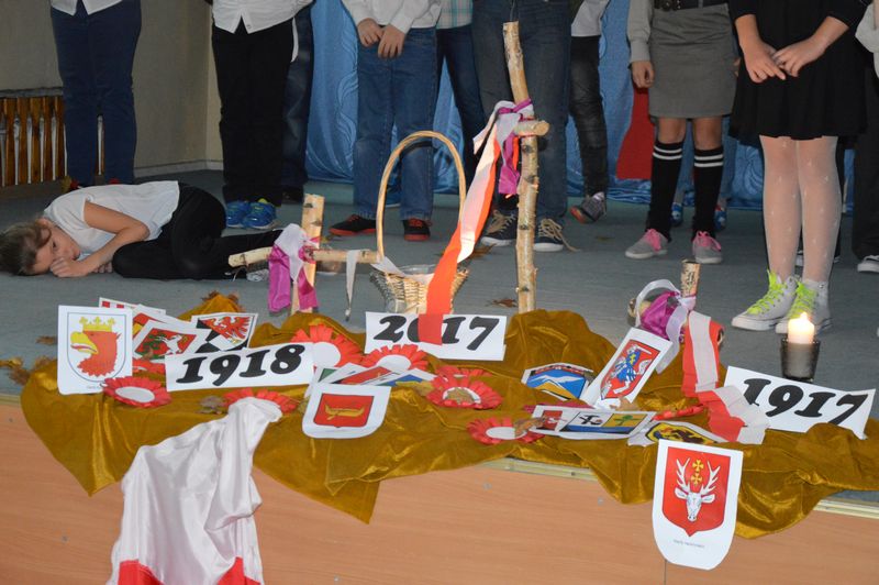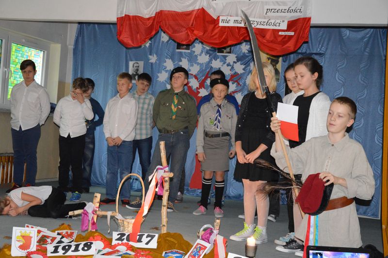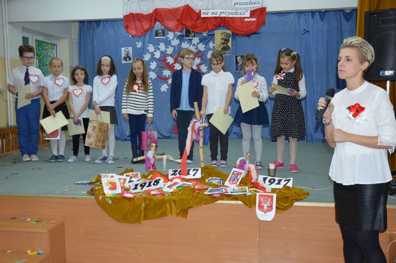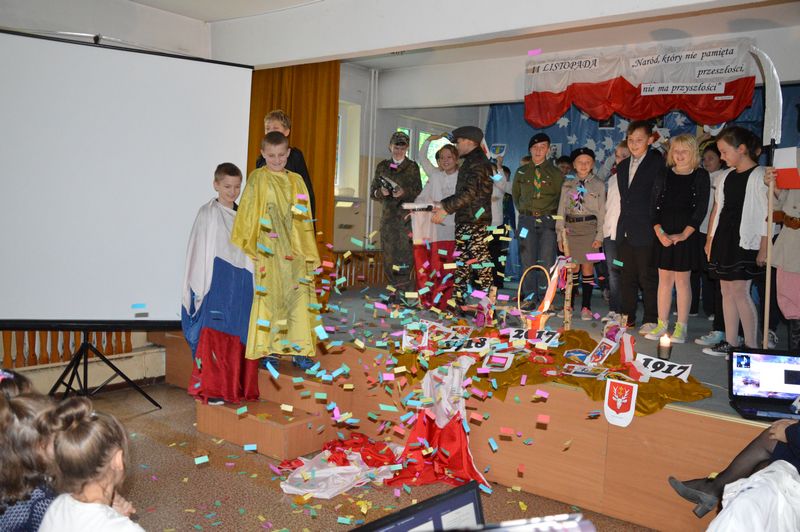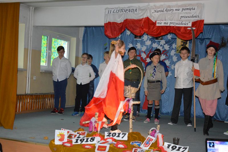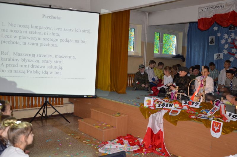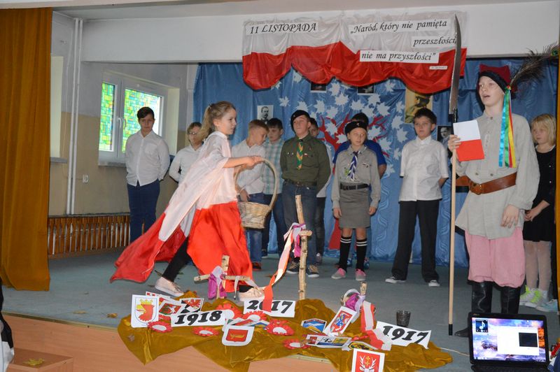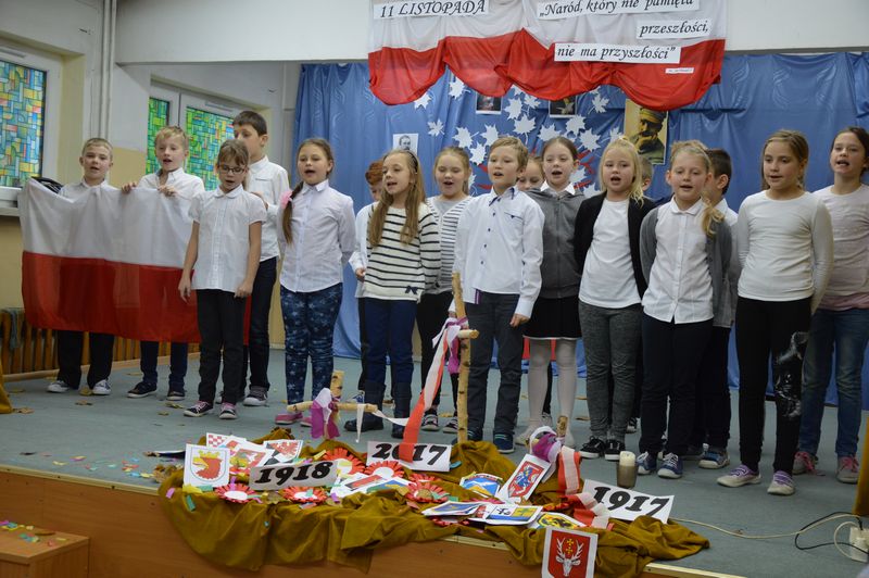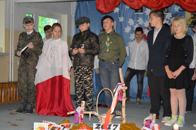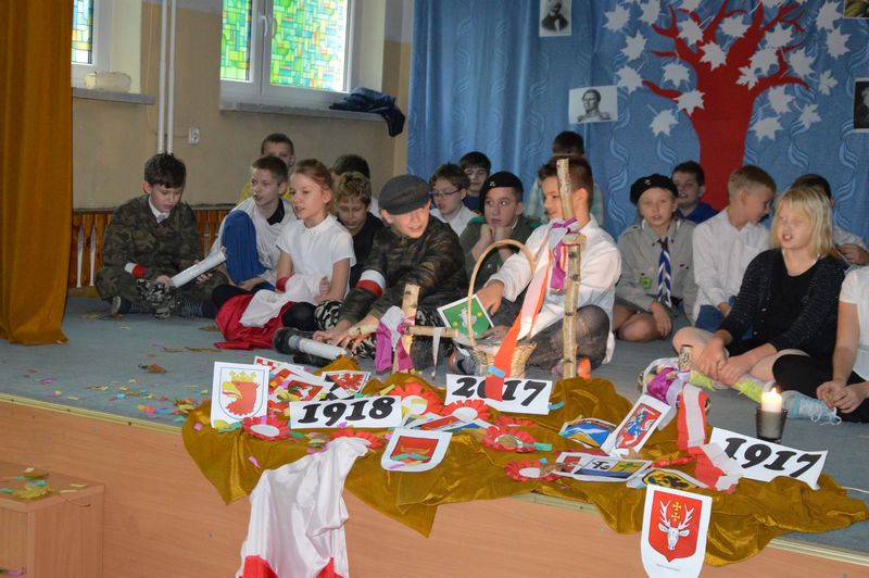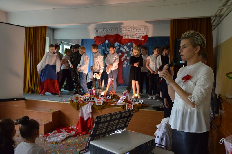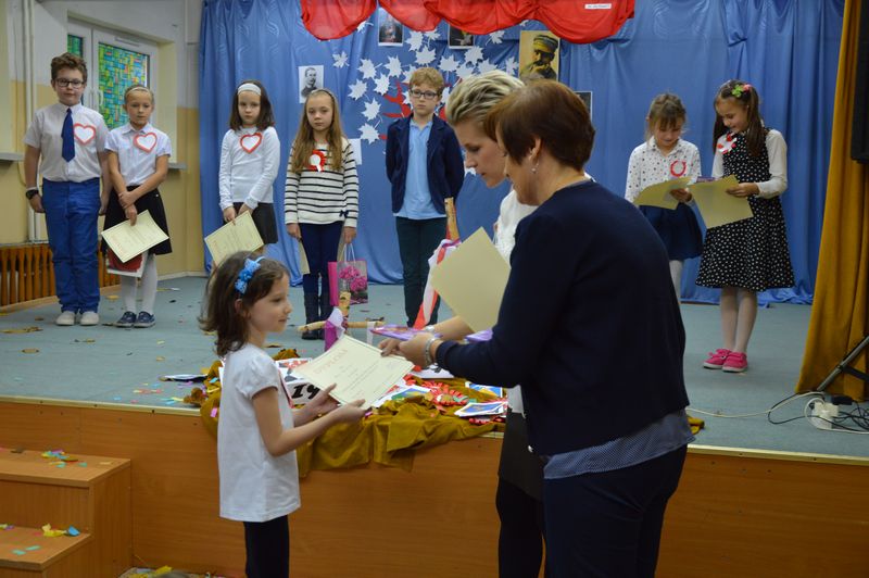 Dnia 10 listopada obchodziliśmy w naszej szkole Dzień Niepodległości. Klasa Va wraz z wychowawczynią panią Jolantą Krzyworzeką przygotowała piękną inscenizację z okazji 99 rocznicy odzyskania przez Polskę niepodległości. Podczas tej uroczystości przypomniane zostały nam dni 123 lat niewoli Polski, począwszy od dnia kiedy Polska jako niepodległe państwo przestała istnieć na mapie Europy, przez dzieje narodu polskiego w okresie zaborów, wypełnionego walką o wyzwolenie aż do dnia, w którym wzeszła jutrzenka wolności. Po krótkim występie uczniowie wspólnie zaśpiewali pieśni patriotyczne, m.in; Pierwsza Brygada, O mój Rozmarynie, Wojenko, wojenko, Rota, Pierwsza Kadrowa, które przypomniały nam, jak ważna dla Polaka jest wolność i ojczyzna.