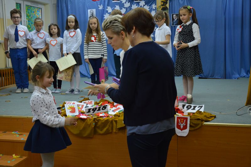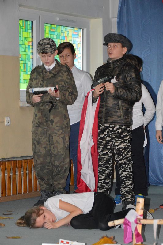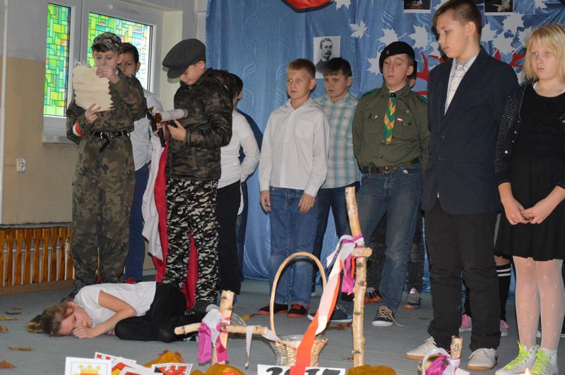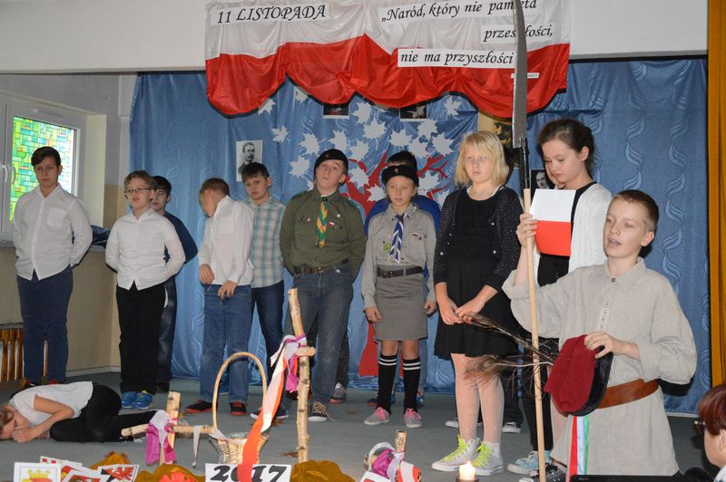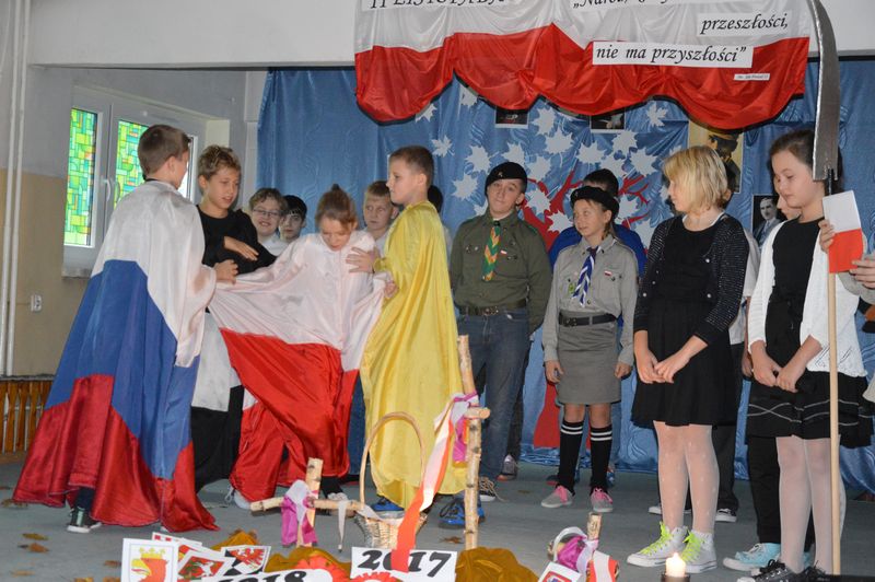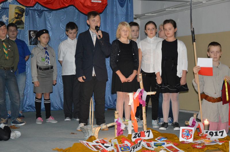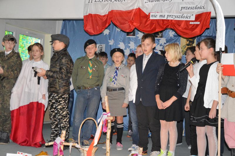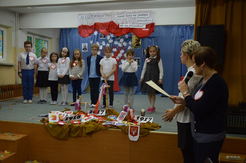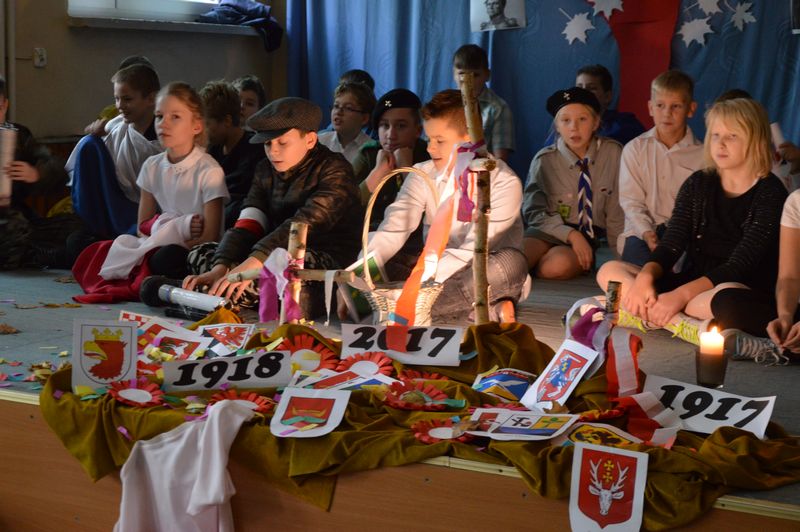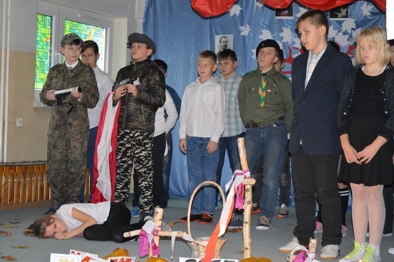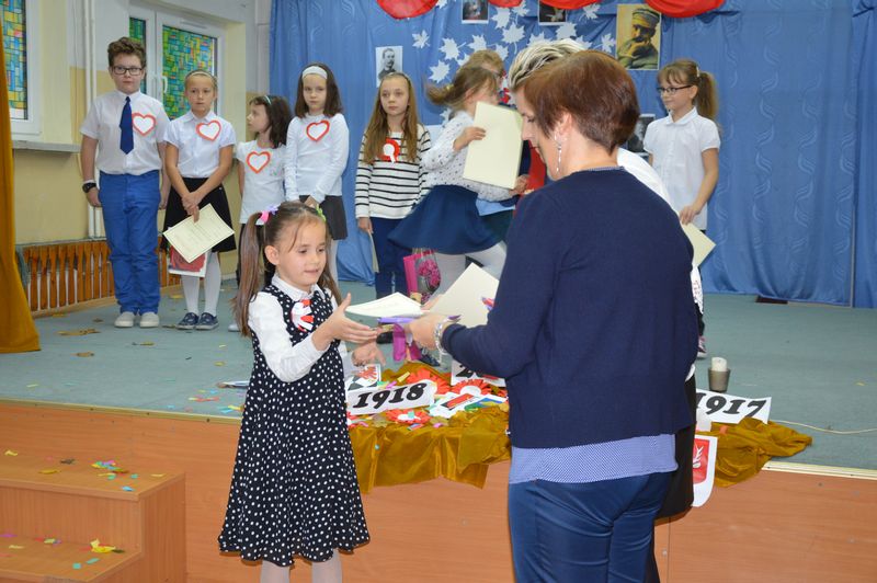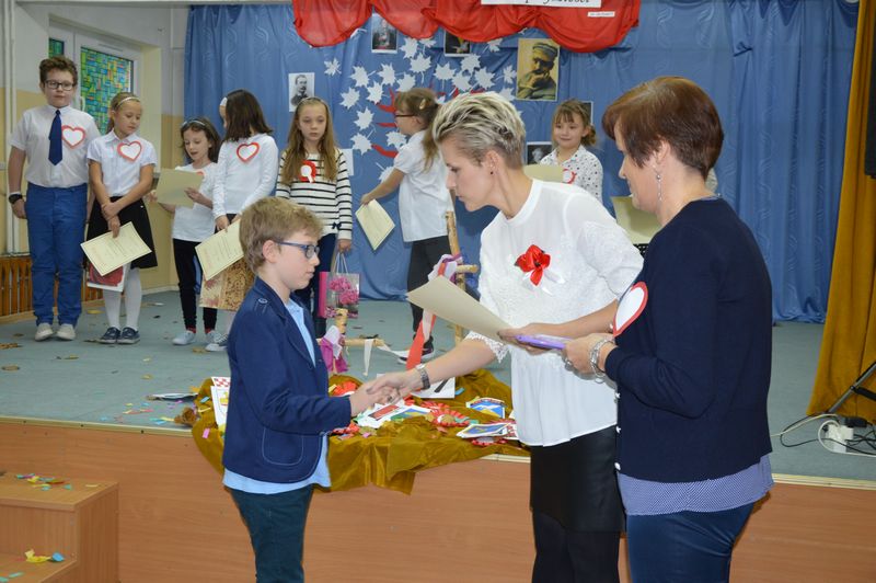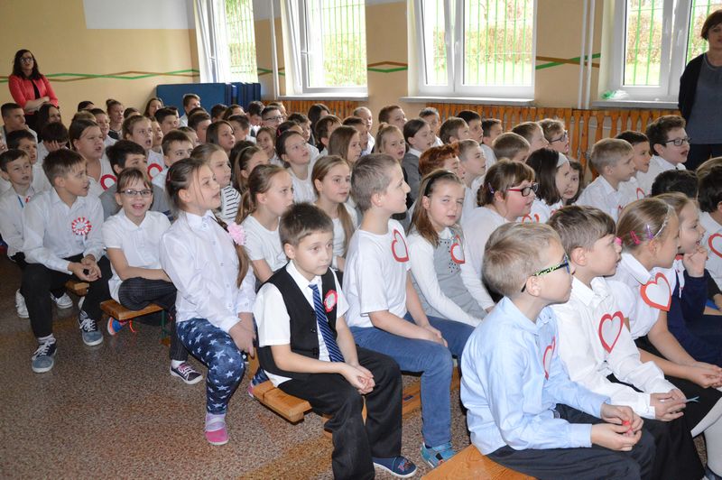 Dnia 10 listopada obchodziliśmy w naszej szkole Dzień Niepodległości. Klasa Va wraz z wychowawczynią panią Jolantą Krzyworzeką przygotowała piękną inscenizację z okazji 99 rocznicy odzyskania przez Polskę niepodległości. Podczas tej uroczystości przypomniane zostały nam dni 123 lat niewoli Polski, począwszy od dnia kiedy Polska jako niepodległe państwo przestała istnieć na mapie Europy, przez dzieje narodu polskiego w okresie zaborów, wypełnionego walką o wyzwolenie aż do dnia, w którym wzeszła jutrzenka wolności. Po krótkim występie uczniowie wspólnie zaśpiewali pieśni patriotyczne, m.in; Pierwsza Brygada, O mój Rozmarynie, Wojenko, wojenko, Rota, Pierwsza Kadrowa, które przypomniały nam, jak ważna dla Polaka jest wolność i ojczyzna.