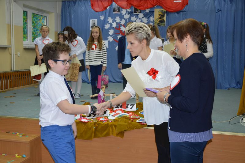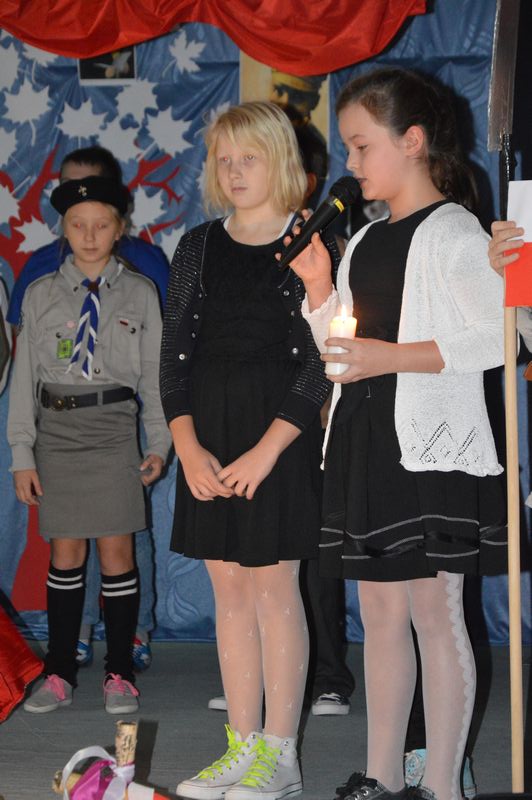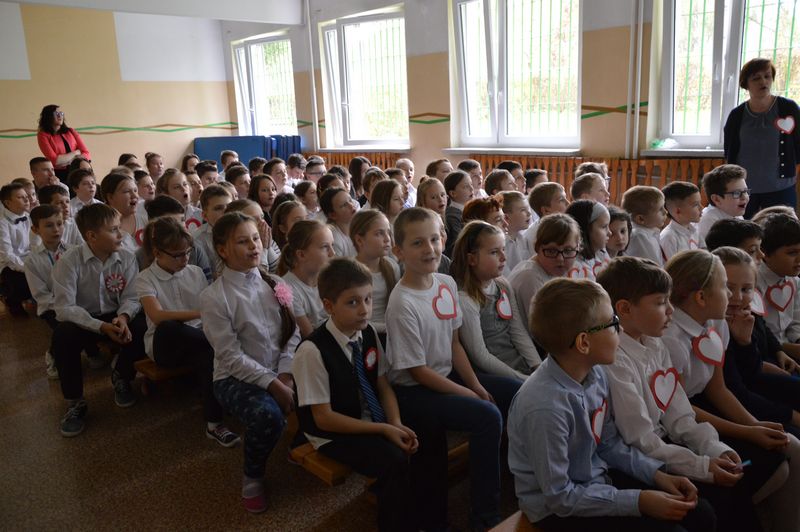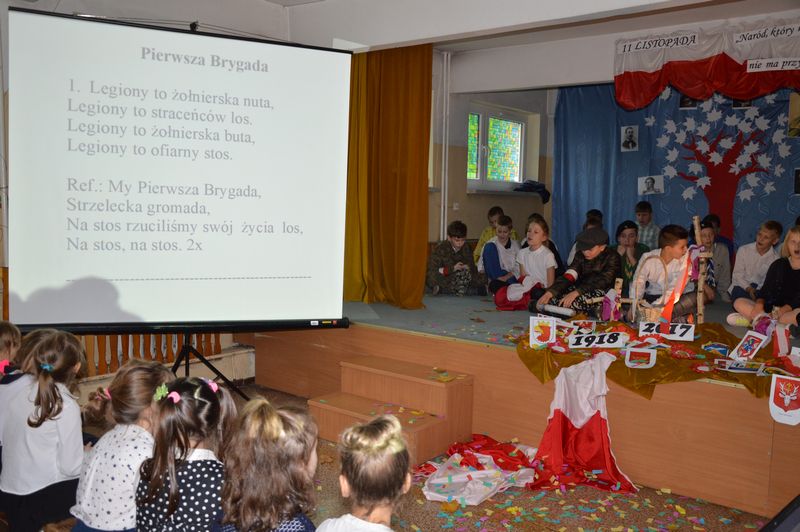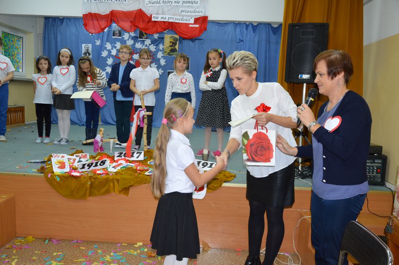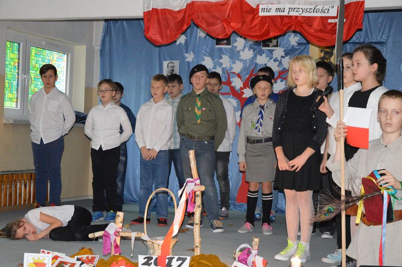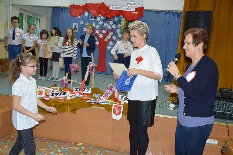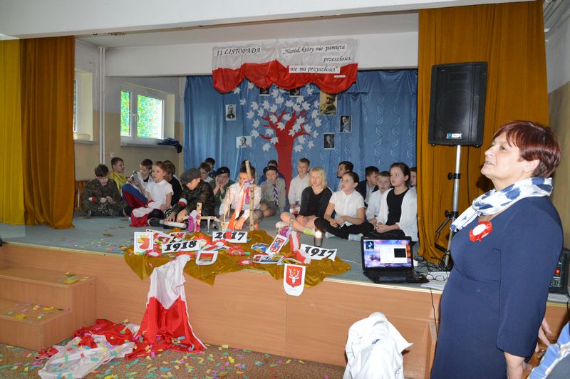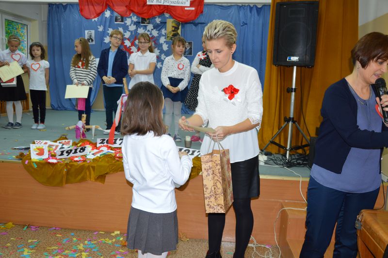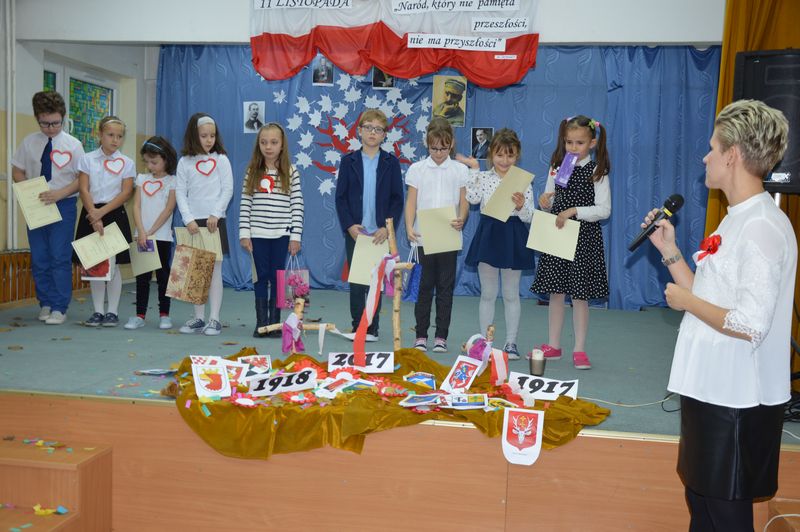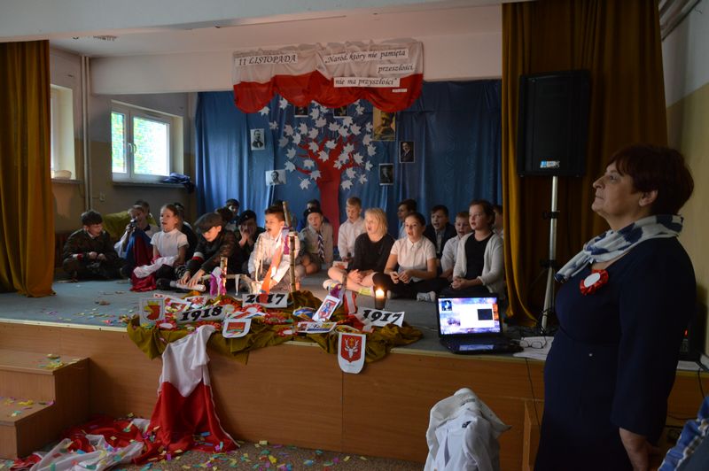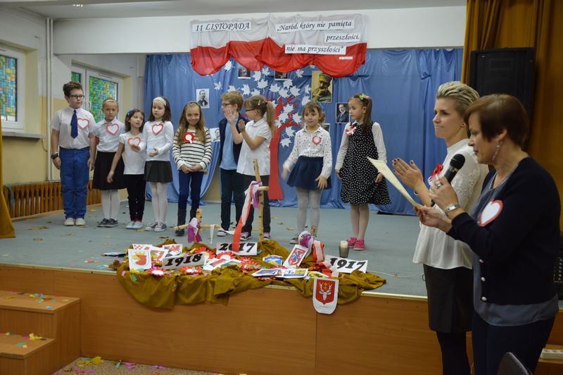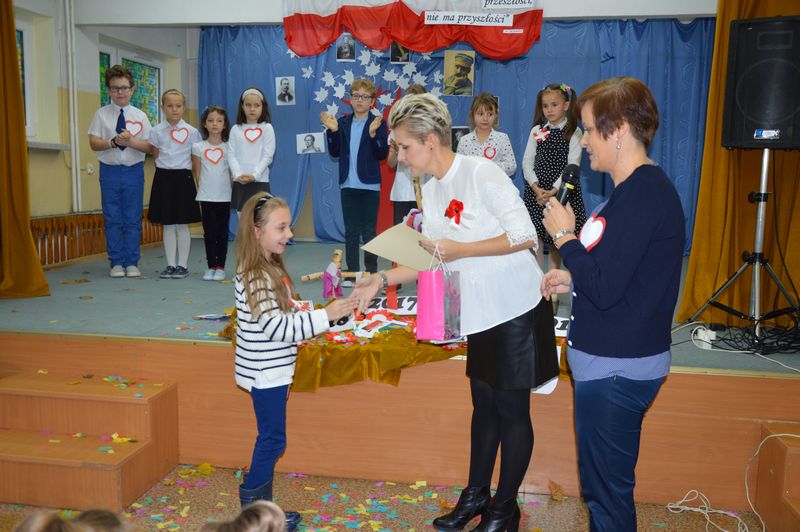 Dnia 10 listopada obchodziliśmy w naszej szkole Dzień Niepodległości. Klasa Va wraz z wychowawczynią panią Jolantą Krzyworzeką przygotowała piękną inscenizację z okazji 99 rocznicy odzyskania przez Polskę niepodległości. Podczas tej uroczystości przypomniane zostały nam dni 123 lat niewoli Polski, począwszy od dnia kiedy Polska jako niepodległe państwo przestała istnieć na mapie Europy, przez dzieje narodu polskiego w okresie zaborów, wypełnionego walką o wyzwolenie aż do dnia, w którym wzeszła jutrzenka wolności. Po krótkim występie uczniowie wspólnie zaśpiewali pieśni patriotyczne, m.in; Pierwsza Brygada, O mój Rozmarynie, Wojenko, wojenko, Rota, Pierwsza Kadrowa, które przypomniały nam, jak ważna dla Polaka jest wolność i ojczyzna.