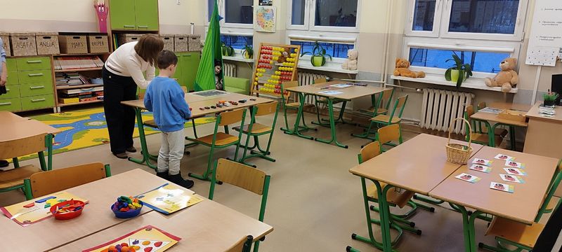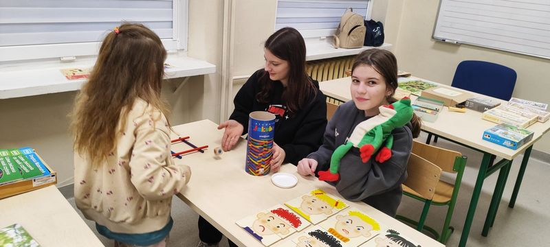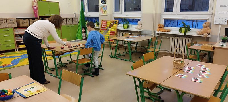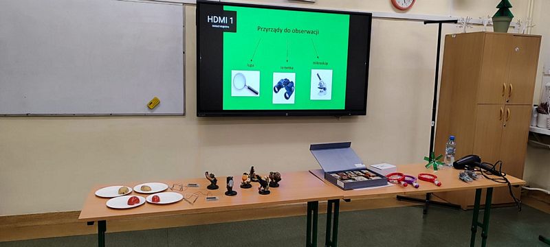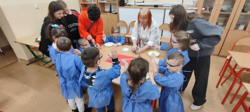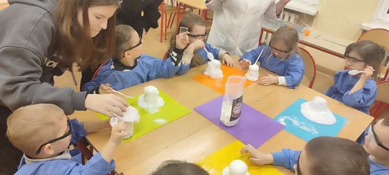 W szkolnych pracowniach czekały prawdziwe naukowe czary. Pod okiem „Pani od chemii” mali odkrywcy sprawdzali, jak działa wulkan, tworzyli zimne ognie i malowali na mleku, przekonując się, że nauka potrafi być czystą magią. W salach matematyczno‑fizycznej i edukacji wczesnoszkolnej dzieci poznawały tajemnice tęczy, uczyły się, czym są zbiory, wyczarowywały „pioruny” i tworzyły matematyczne, plastelinowe stwory, które pomagały im liczyć i porządkować świat. Dużo emocji wzbudziło także doświadczenie z kołem Newtona, dzięki któremu najmłodsi mogli zobaczyć, że białe światło składa się z barw tęczy. Z „Panią od przyrody” przedszkolaki oglądały zwierzęta morskie zakonserwowane w akrylu oraz modele ptaków, poznawały wybrane gatunki i ich cechy. Słuchały również śpiewu czyżyka, ucząc się rozpoznawania głosów ptaków. Tu także nie obyło się bez eksperymentowania, dzieci zbudowały zegar zasilany pomidorem, sprawdziły działanie małego wiatraka oraz samodzielnie wytworzyły zieloną energię, uruchamiając lampkę dynamo. Na zakończenie rozwiązały zagadkę „Owad czy nie owad?”, polegającą na posegregowaniu organizmów utrwalonych w akrylu na podstawie liczby odnóży krocznych.