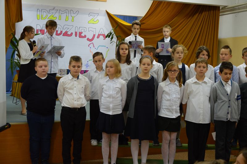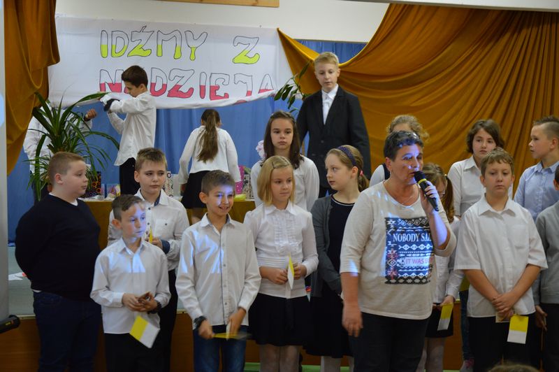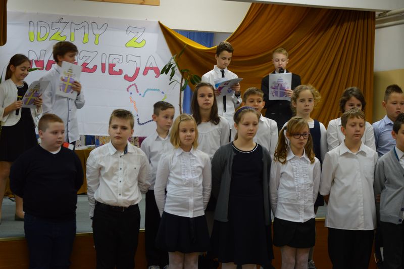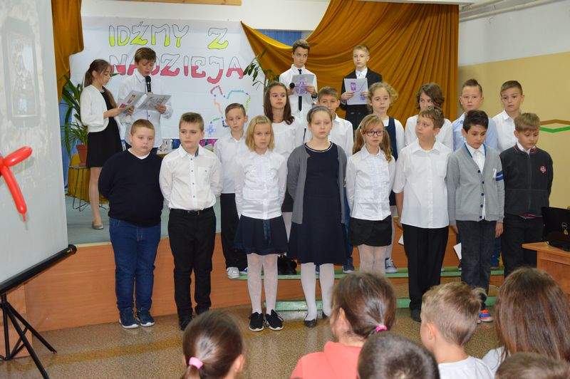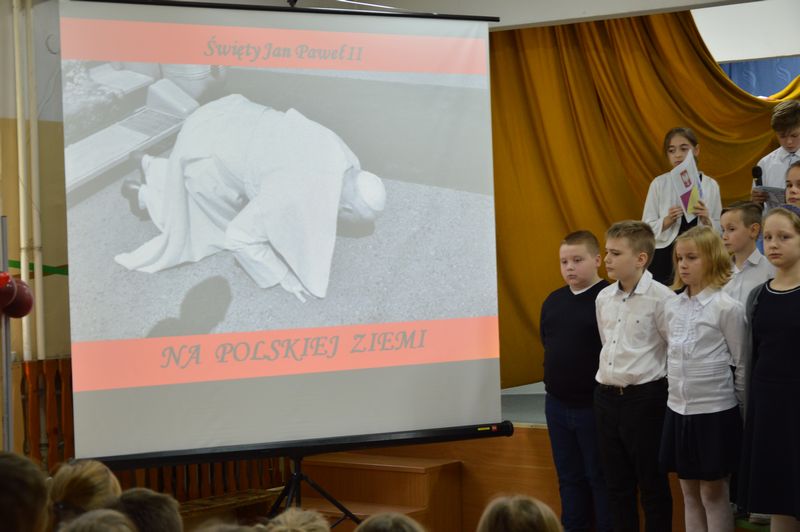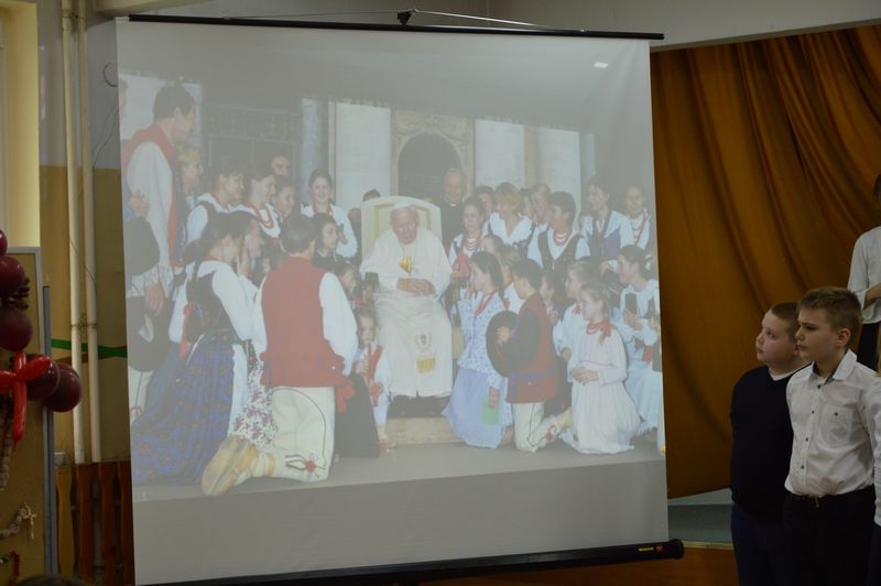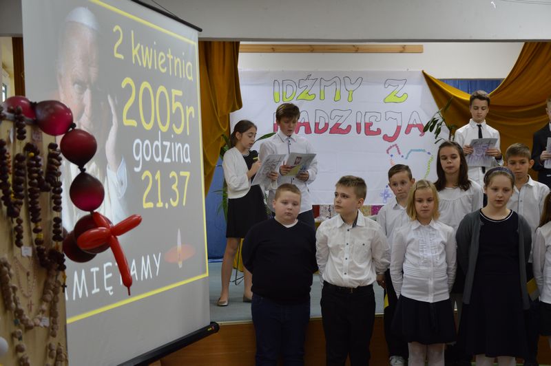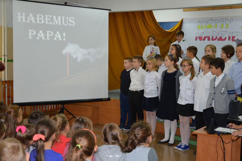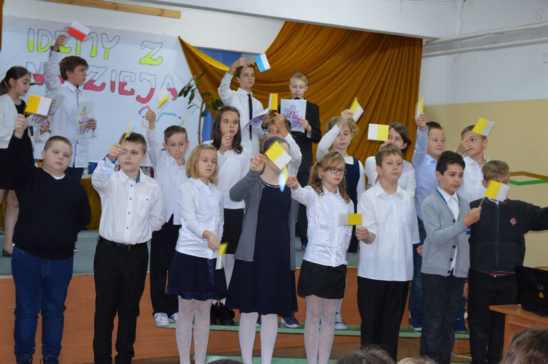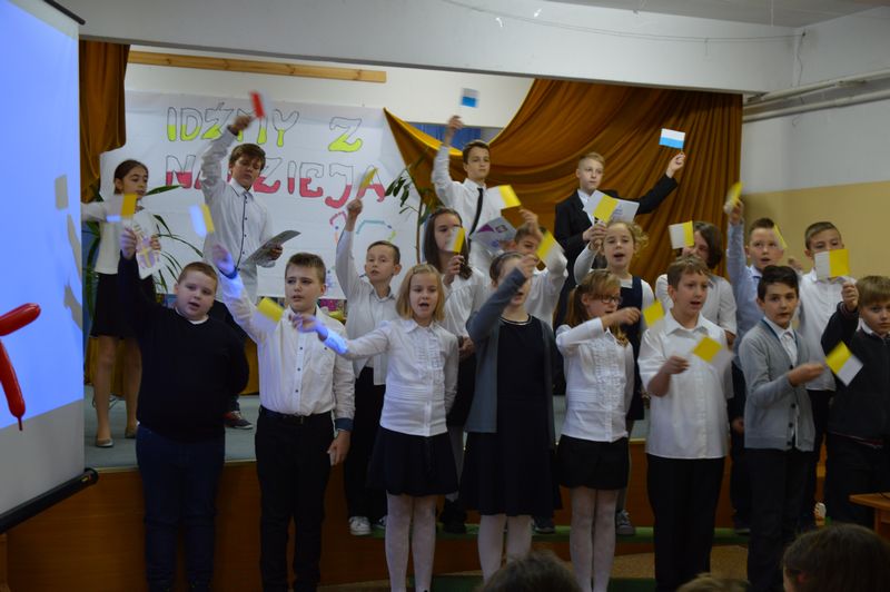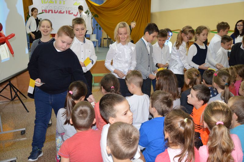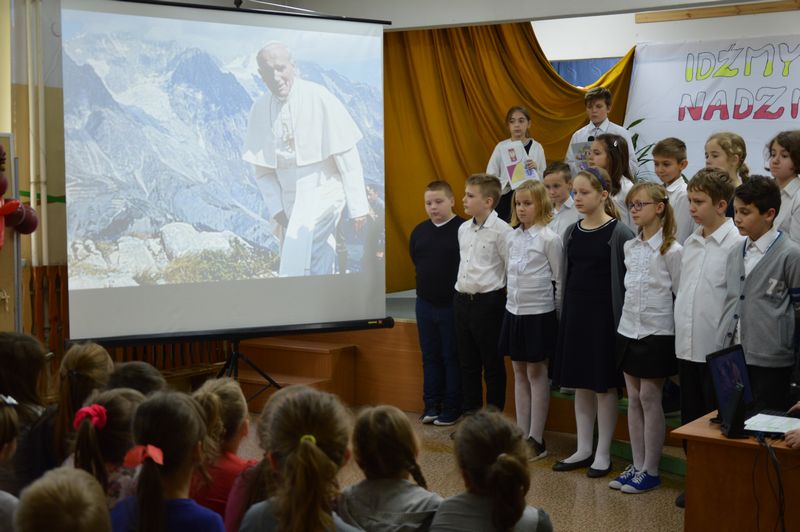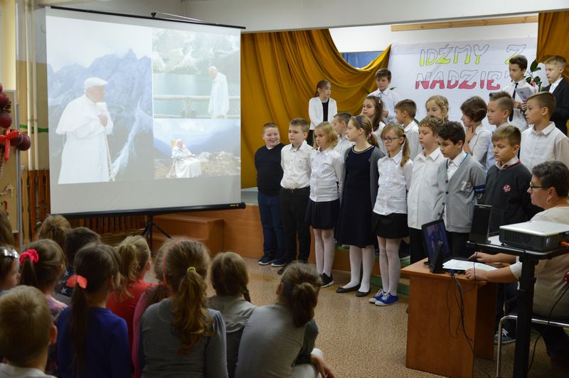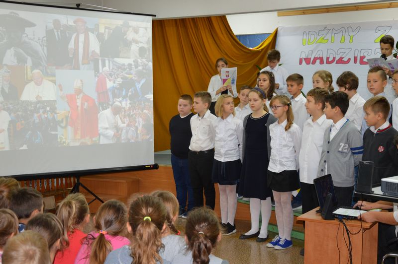 16 października obchodziliśmy w naszej szkole Dzień Papieski. Tegoroczna uroczystość przebiegała pod hasłem "Idźmy naprzód z nadzieją". Uczniowie klasy IVb pod kierunkiem pani Małgorzaty Wyjadłowskiej przygotowali program słowno-muzyczny, podczas którego przybliżyli najważniejsze fakty z życia Jana Pawła II i jego refleksje o nadziei. Ukazali papieża jako niestrudzonego pielgrzyma, orędownika pokoju i miłości, człowieka który lubił chodzić po górskich szlakach, który zachęcał nas do życia w świętości. Pani Małgorzata opowiedziała nam kilka anegdotek z życia Jana Pawła II, ponieważ jak pamiętamy papież uwielbiał żartować. Następnie uczniowie zaśpiewali ukochaną pieśń papieża "Barkę" oraz rozdali wszystkim zgromadzonym uczniom i nauczycielom biało-żółte chorągiewki oraz obrazki z wizerunkiem Jana Pawła II.