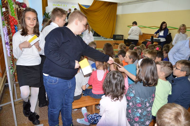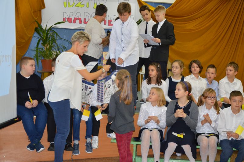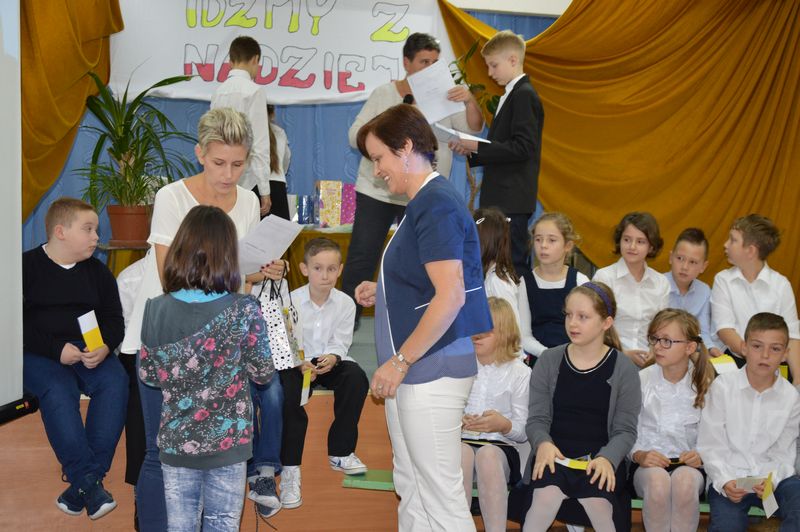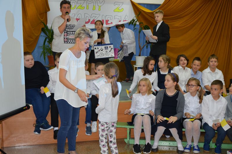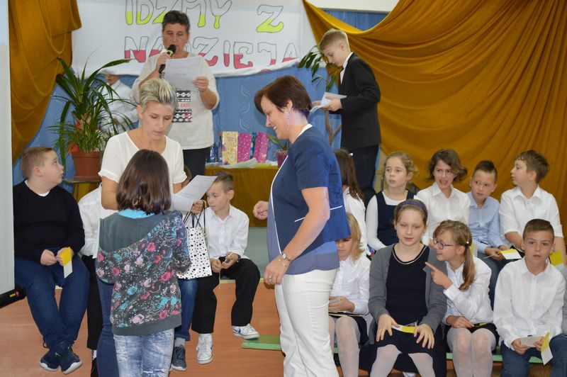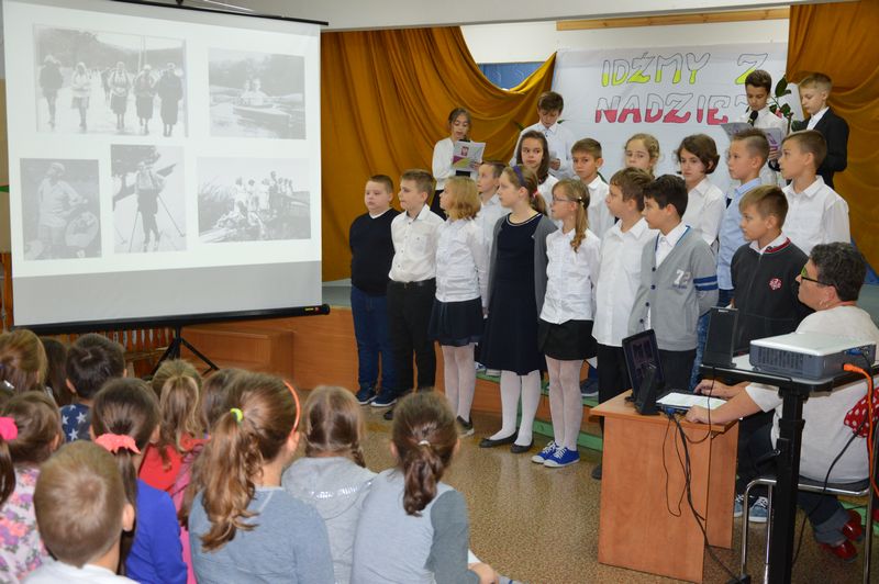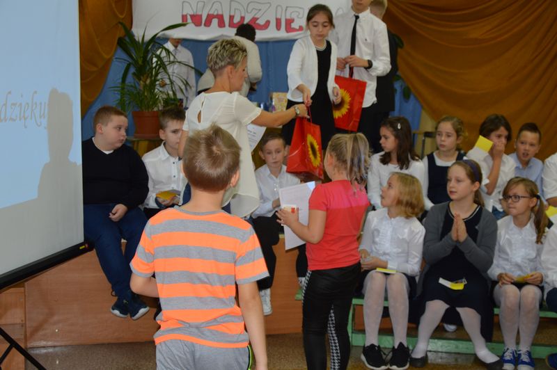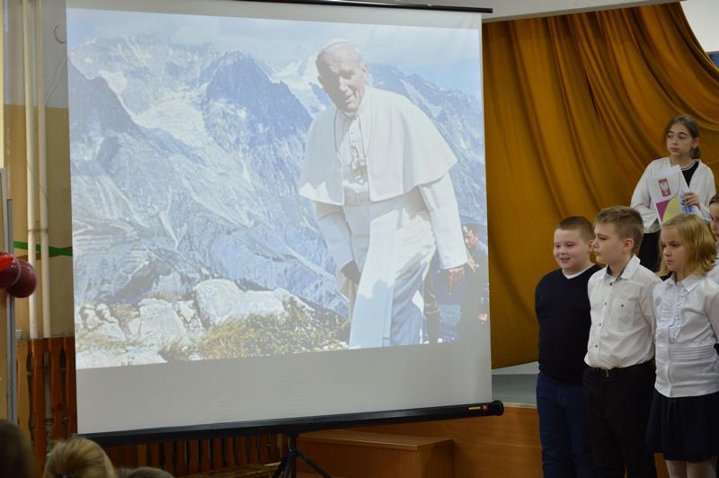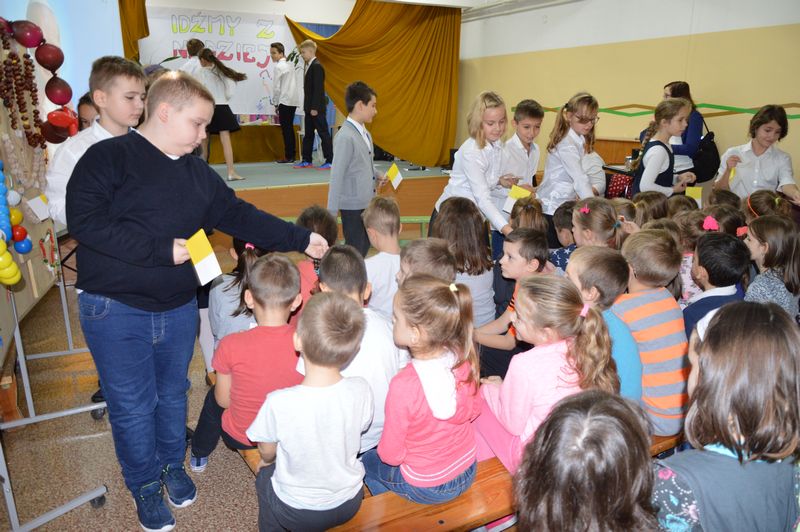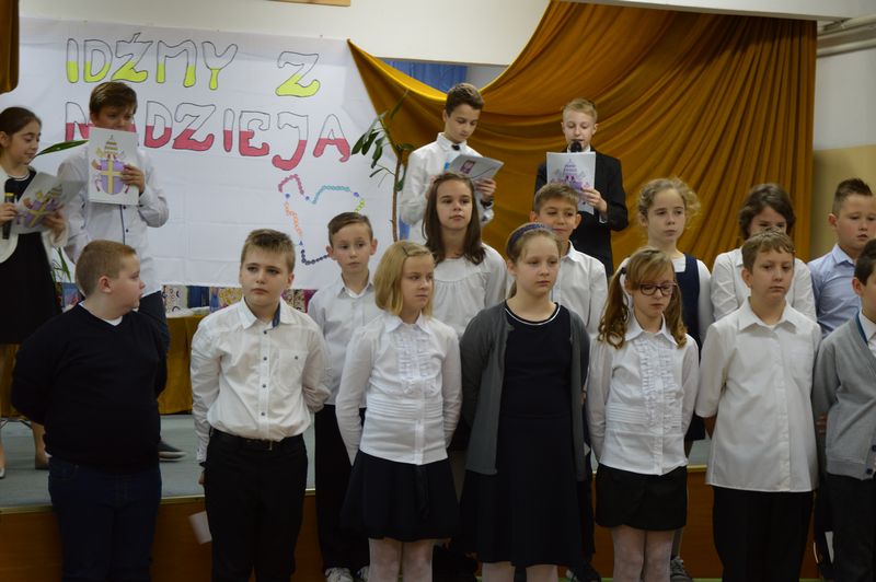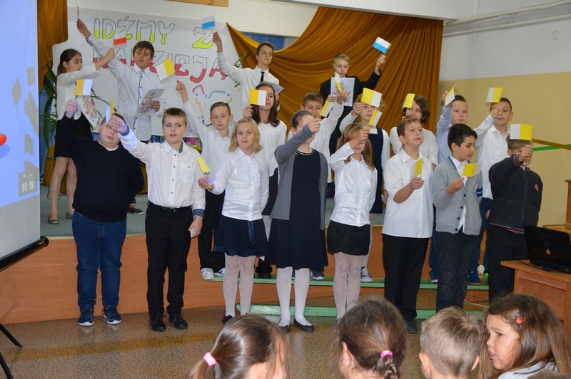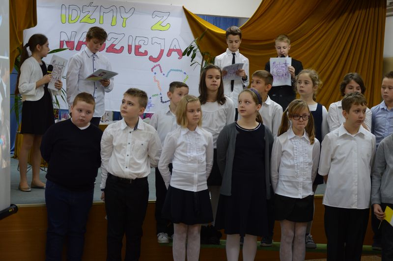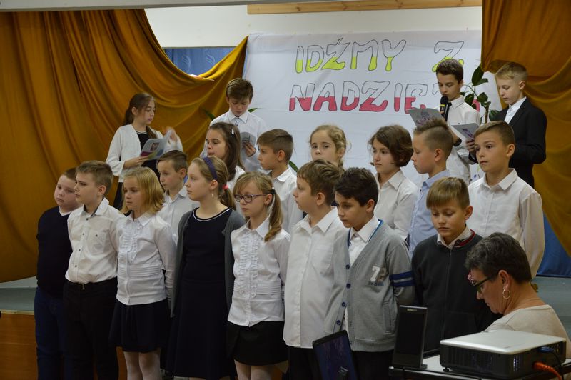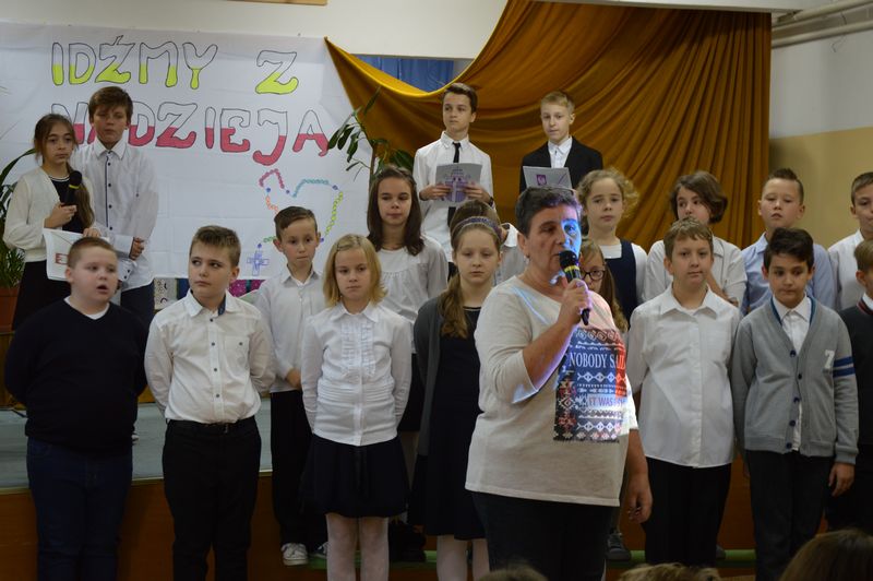 16 października obchodziliśmy w naszej szkole Dzień Papieski. Tegoroczna uroczystość przebiegała pod hasłem "Idźmy naprzód z nadzieją". Uczniowie klasy IVb pod kierunkiem pani Małgorzaty Wyjadłowskiej przygotowali program słowno-muzyczny, podczas którego przybliżyli najważniejsze fakty z życia Jana Pawła II i jego refleksje o nadziei. Ukazali papieża jako niestrudzonego pielgrzyma, orędownika pokoju i miłości, człowieka który lubił chodzić po górskich szlakach, który zachęcał nas do życia w świętości. Pani Małgorzata opowiedziała nam kilka anegdotek z życia Jana Pawła II, ponieważ jak pamiętamy papież uwielbiał żartować. Następnie uczniowie zaśpiewali ukochaną pieśń papieża "Barkę" oraz rozdali wszystkim zgromadzonym uczniom i nauczycielom biało-żółte chorągiewki oraz obrazki z wizerunkiem Jana Pawła II.