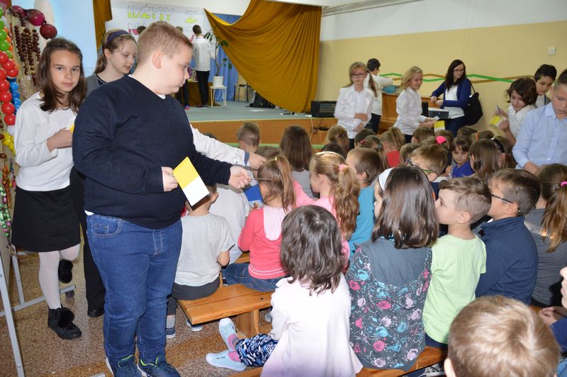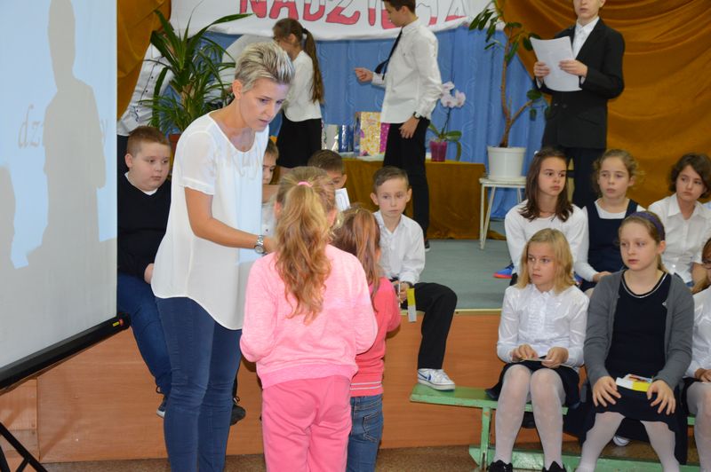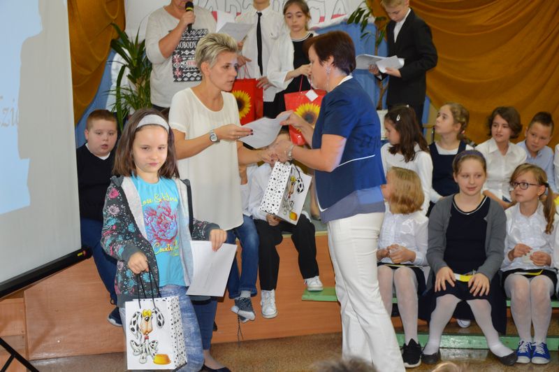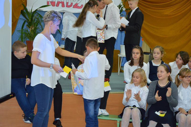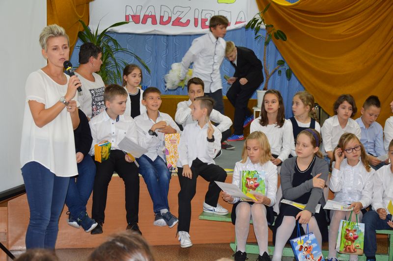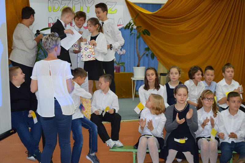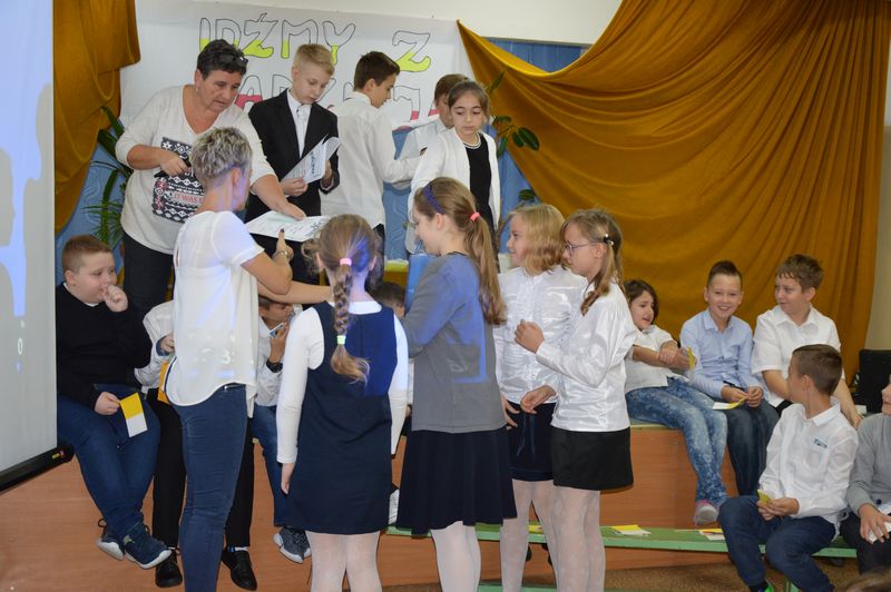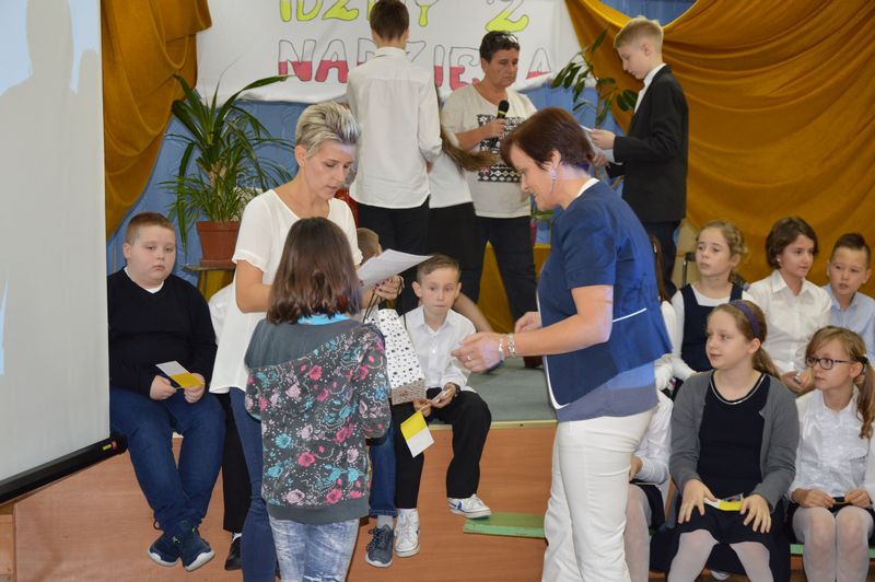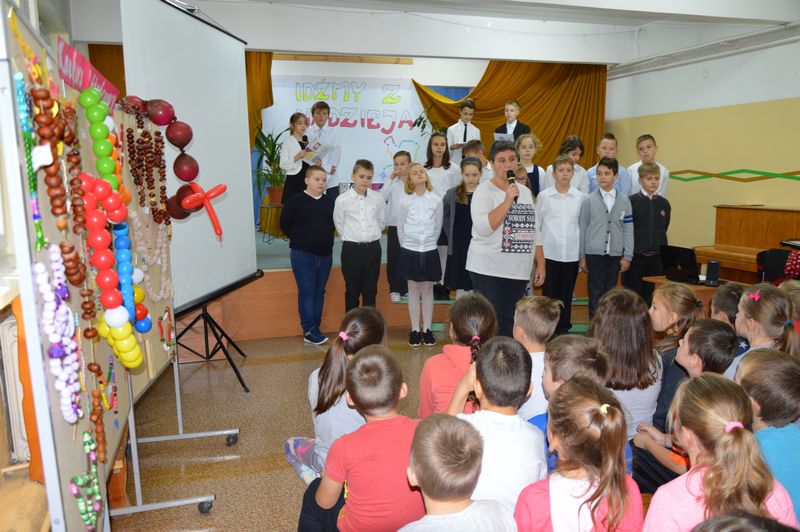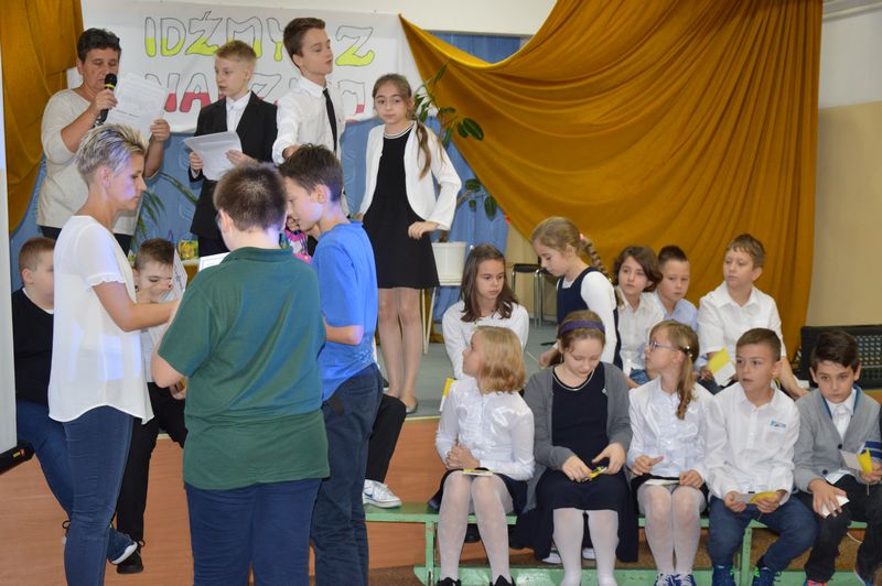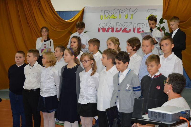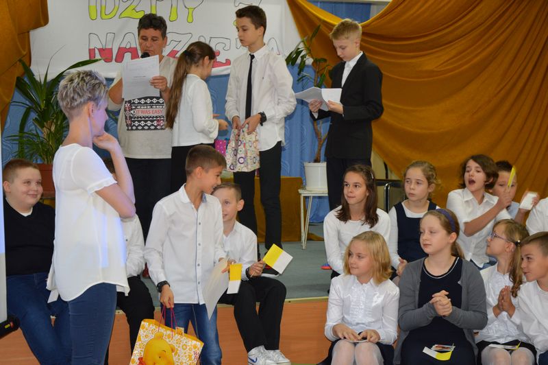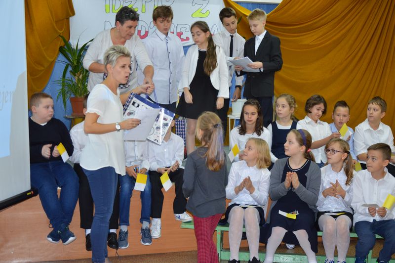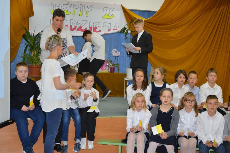 16 października obchodziliśmy w naszej szkole Dzień Papieski. Tegoroczna uroczystość przebiegała pod hasłem "Idźmy naprzód z nadzieją". Uczniowie klasy IVb pod kierunkiem pani Małgorzaty Wyjadłowskiej przygotowali program słowno-muzyczny, podczas którego przybliżyli najważniejsze fakty z życia Jana Pawła II i jego refleksje o nadziei. Ukazali papieża jako niestrudzonego pielgrzyma, orędownika pokoju i miłości, człowieka który lubił chodzić po górskich szlakach, który zachęcał nas do życia w świętości. Pani Małgorzata opowiedziała nam kilka anegdotek z życia Jana Pawła II, ponieważ jak pamiętamy papież uwielbiał żartować. Następnie uczniowie zaśpiewali ukochaną pieśń papieża "Barkę" oraz rozdali wszystkim zgromadzonym uczniom i nauczycielom biało-żółte chorągiewki oraz obrazki z wizerunkiem Jana Pawła II.