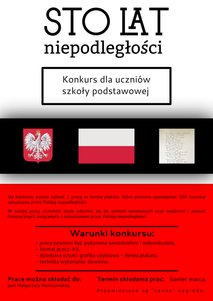W 2018 roku obchodzimy 100 lecie odzyskania przez Polskę niepodległości. W naszej szkole obchody tej pięknej rocznicy rozpoczęliśmy od ogłoszenia konkursu dla naszych uczniów.