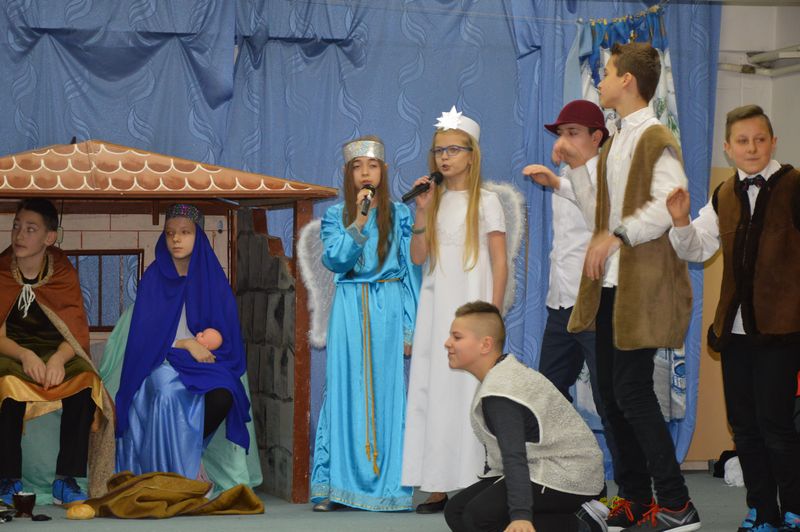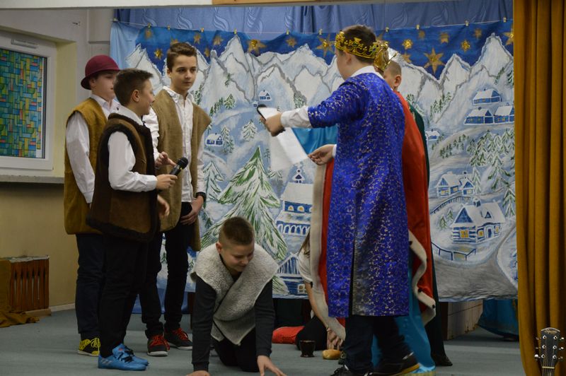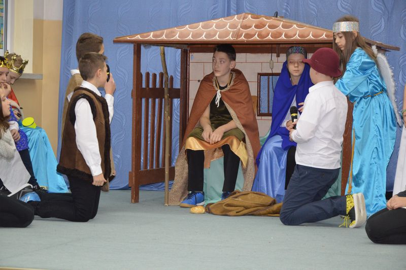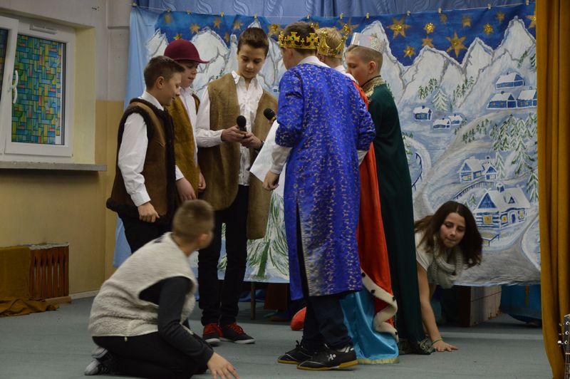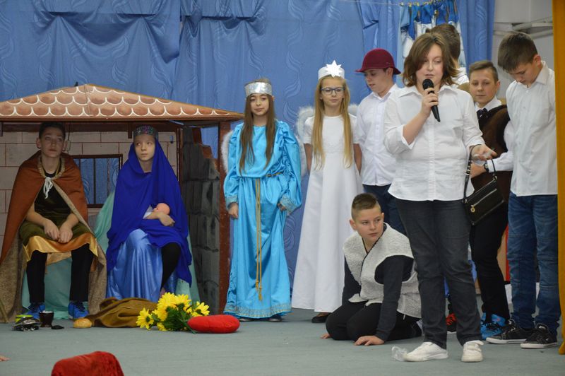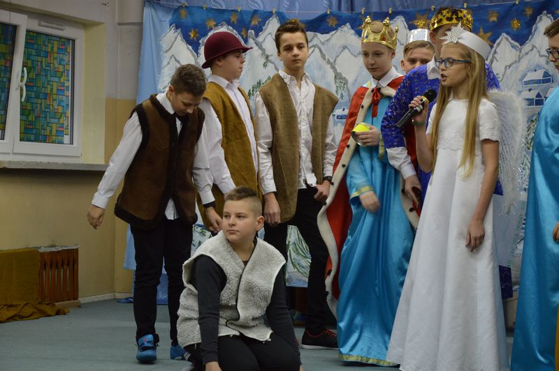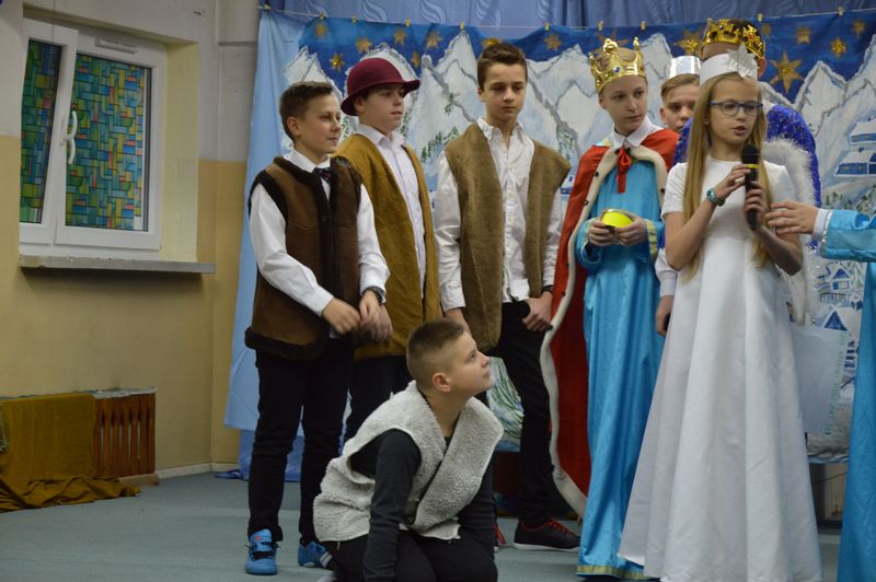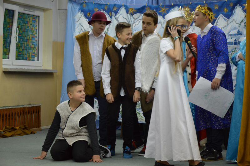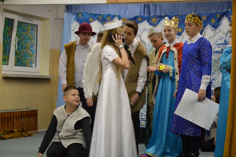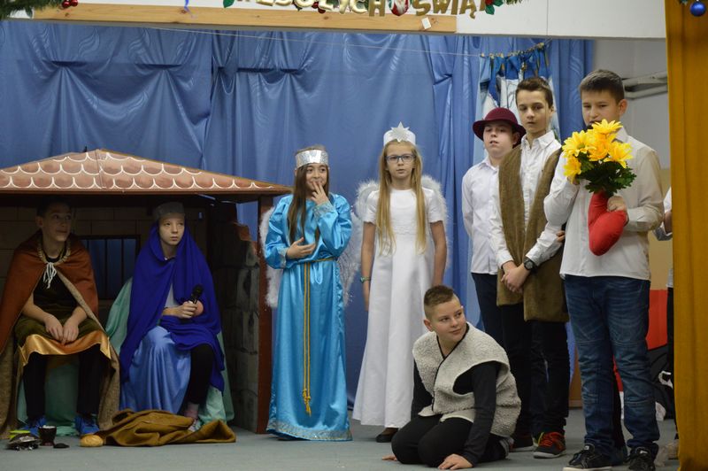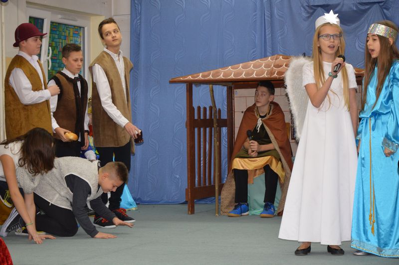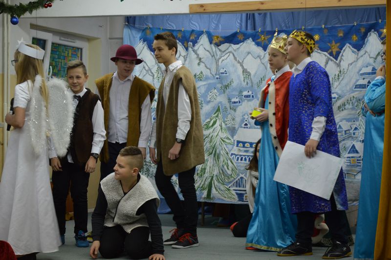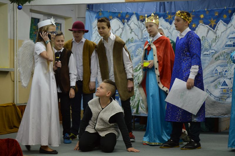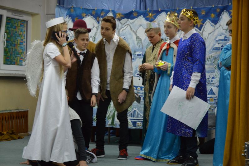 W świąteczną atmosferę wprowadzili nas uczniowie z klasy VI a, którzy przygotowali dla nas przedstawienie jasełkowe. Ucznioiwe na wesoło, z przymrużeniem oka pokazali wydarzenia z przed 2 tysięcy lat, historię dzieciątka Jezus, Maryi i Józefa. Nie zabrakło także diabełków, pastuszków, anioła i Trzech Króli. Część artystyczna została wzbogacona śpiewaniem kolęd i pastorałek. Na koniec Pani Dyrektor- Magdalena Hyla złożyła wszystkim zebranym życzenia bożonarodzeniowe oraz życzyła bezpiecznego wypoczynku. Następnie uczniowie udali się do klas na uroczyste wigilie klasowe.