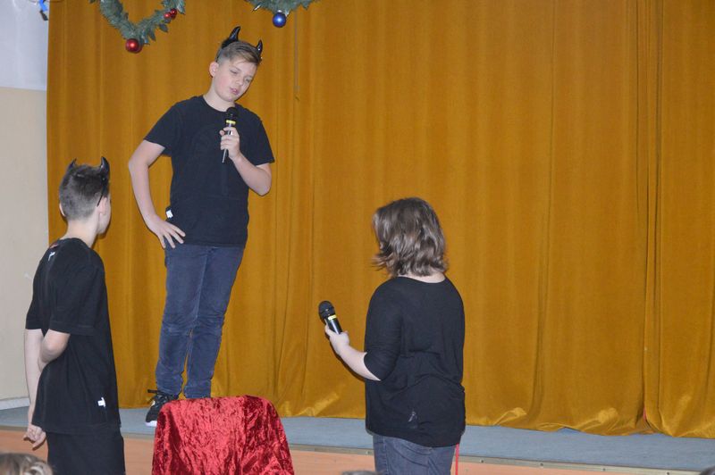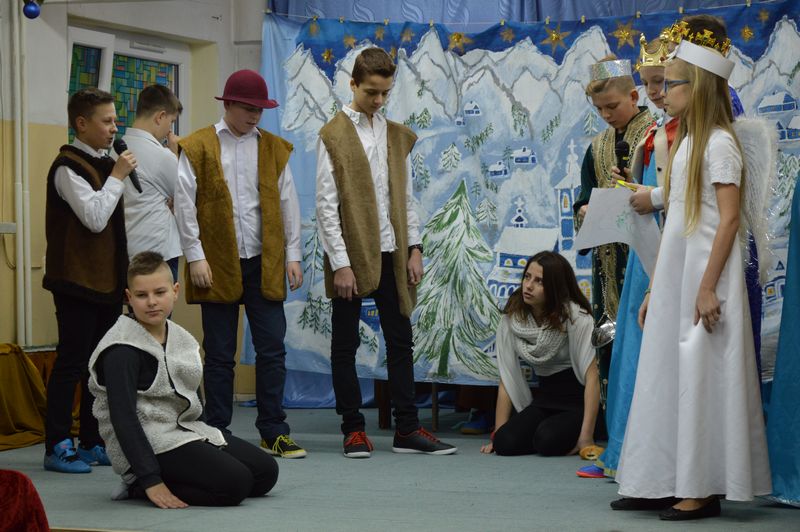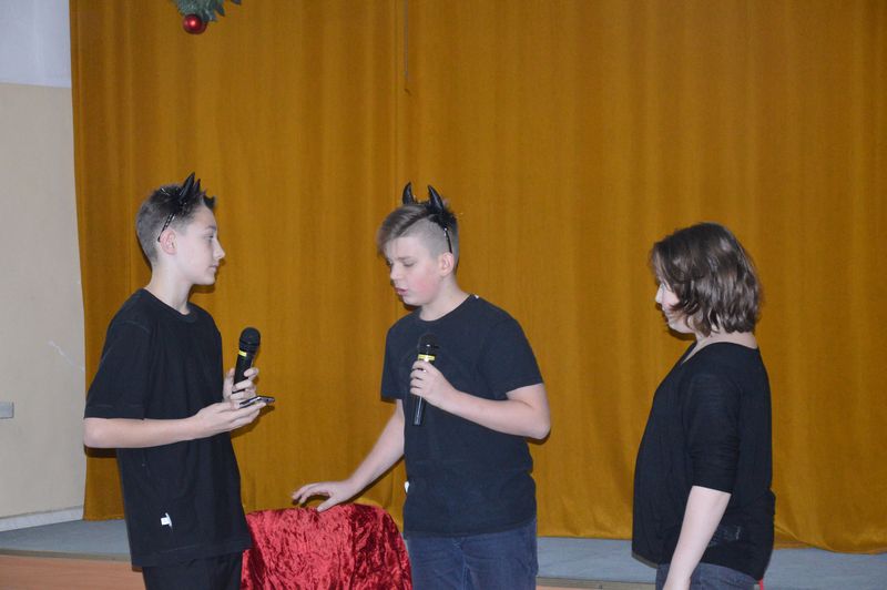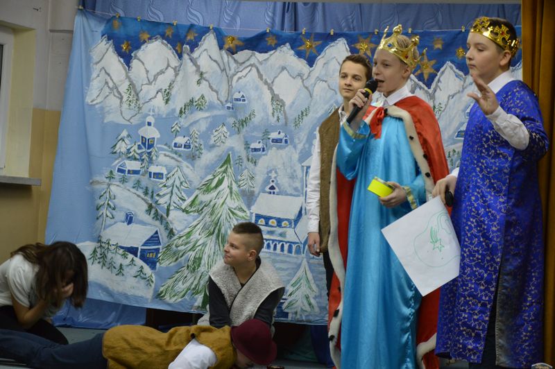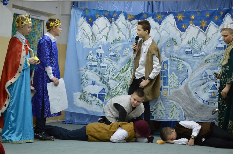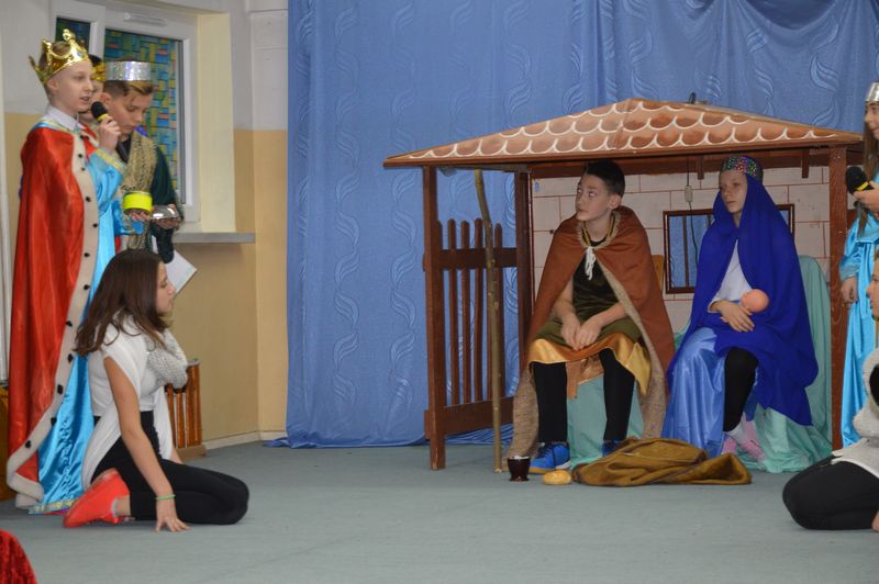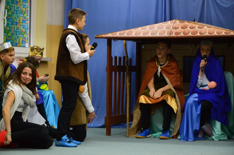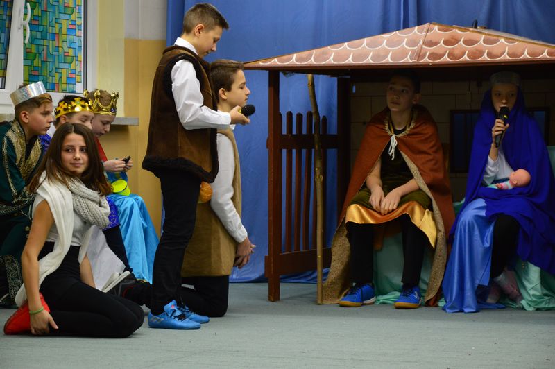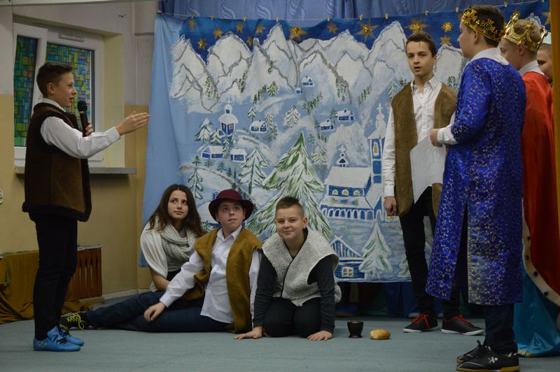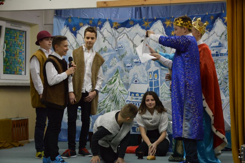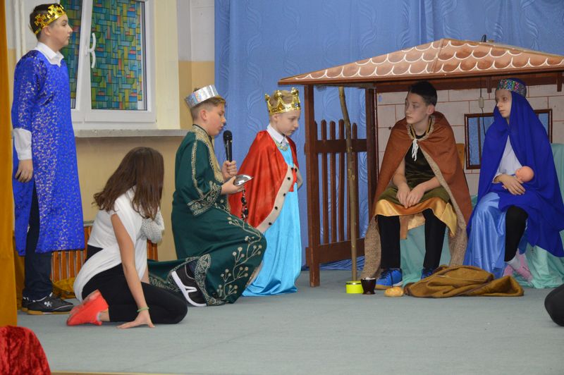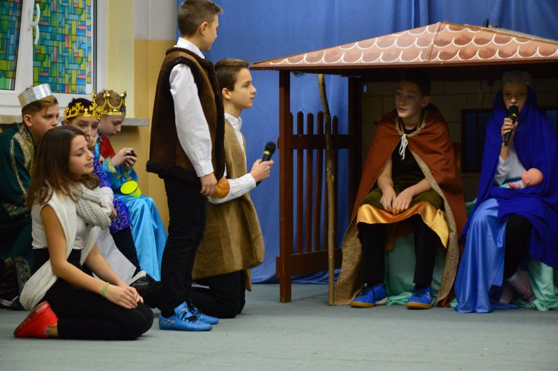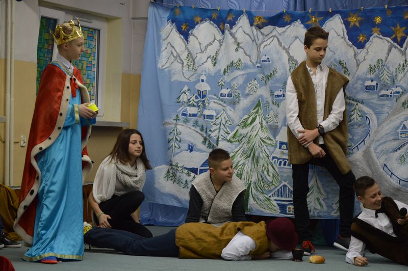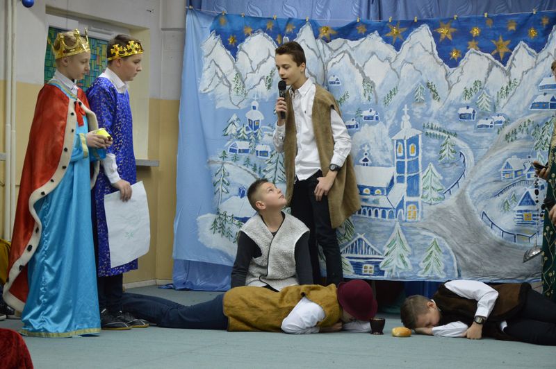 W świąteczną atmosferę wprowadzili nas uczniowie z klasy VI a, którzy przygotowali dla nas przedstawienie jasełkowe. Ucznioiwe na wesoło, z przymrużeniem oka pokazali wydarzenia z przed 2 tysięcy lat, historię dzieciątka Jezus, Maryi i Józefa. Nie zabrakło także diabełków, pastuszków, anioła i Trzech Króli. Część artystyczna została wzbogacona śpiewaniem kolęd i pastorałek. Na koniec Pani Dyrektor- Magdalena Hyla złożyła wszystkim zebranym życzenia bożonarodzeniowe oraz życzyła bezpiecznego wypoczynku. Następnie uczniowie udali się do klas na uroczyste wigilie klasowe.