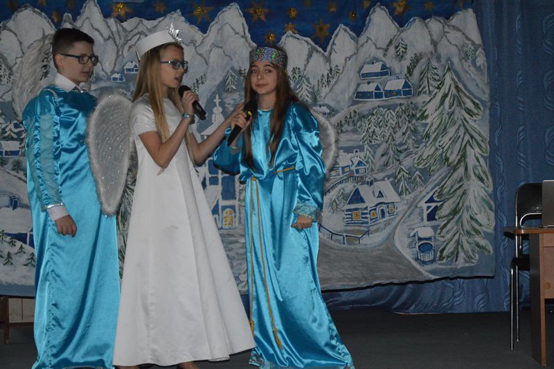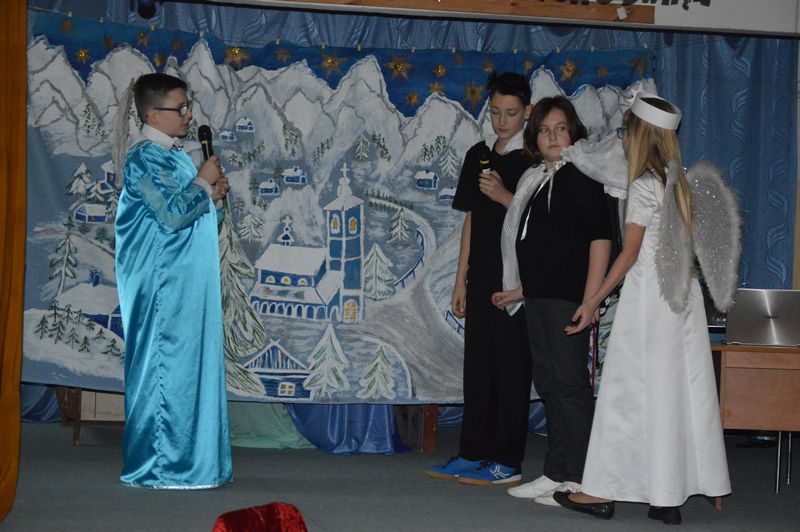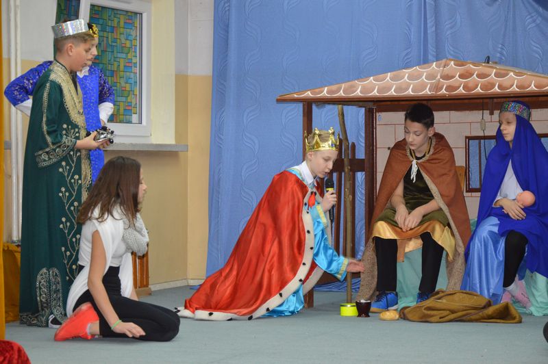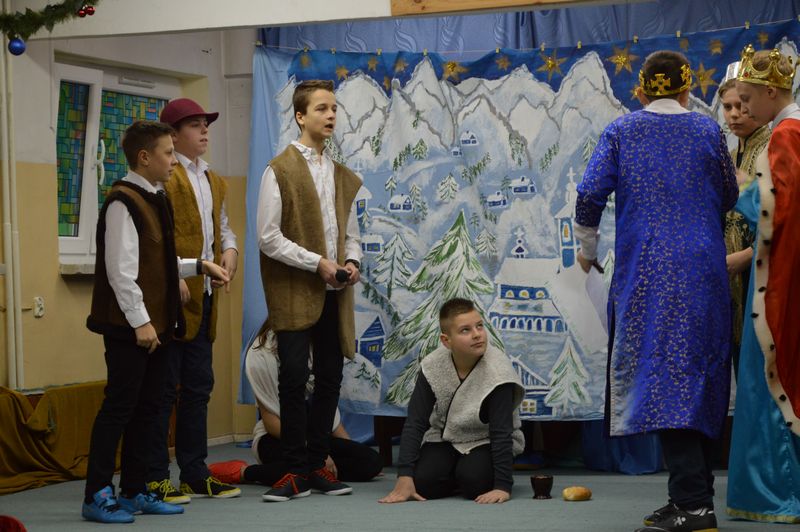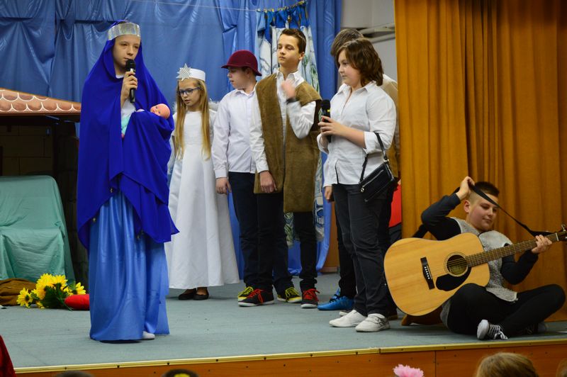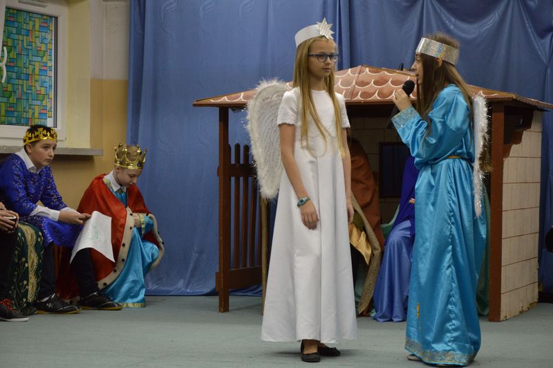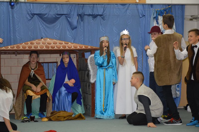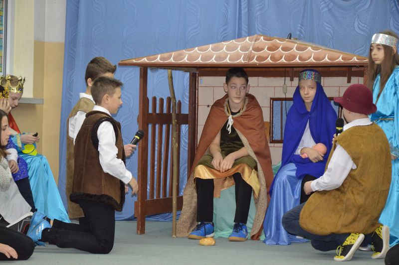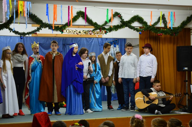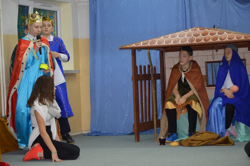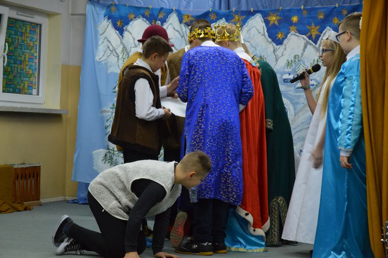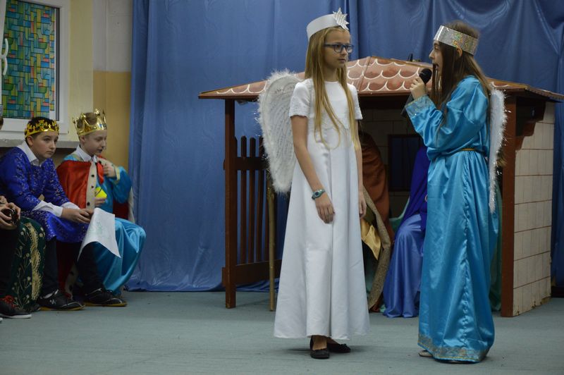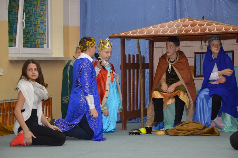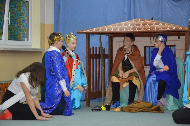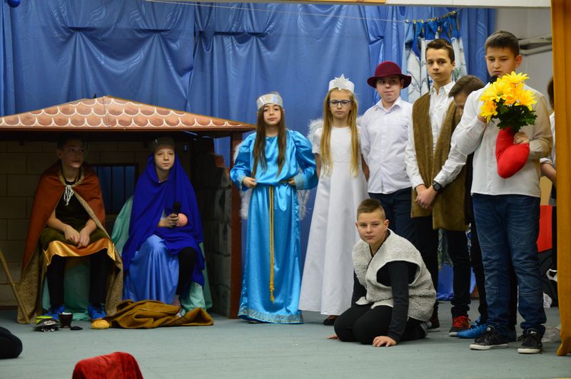 W świąteczną atmosferę wprowadzili nas uczniowie z klasy VI a, którzy przygotowali dla nas przedstawienie jasełkowe. Ucznioiwe na wesoło, z przymrużeniem oka pokazali wydarzenia z przed 2 tysięcy lat, historię dzieciątka Jezus, Maryi i Józefa. Nie zabrakło także diabełków, pastuszków, anioła i Trzech Króli. Część artystyczna została wzbogacona śpiewaniem kolęd i pastorałek. Na koniec Pani Dyrektor- Magdalena Hyla złożyła wszystkim zebranym życzenia bożonarodzeniowe oraz życzyła bezpiecznego wypoczynku. Następnie uczniowie udali się do klas na uroczyste wigilie klasowe.