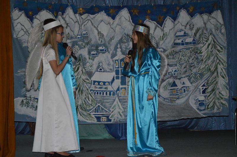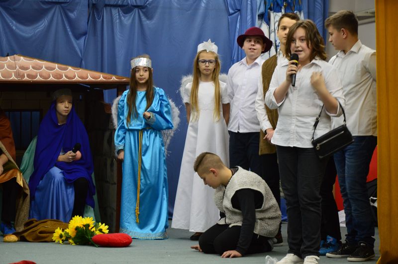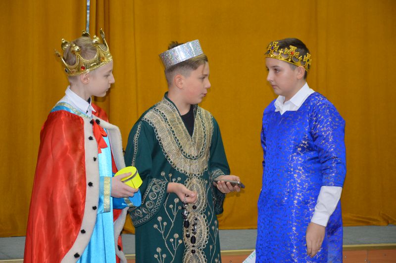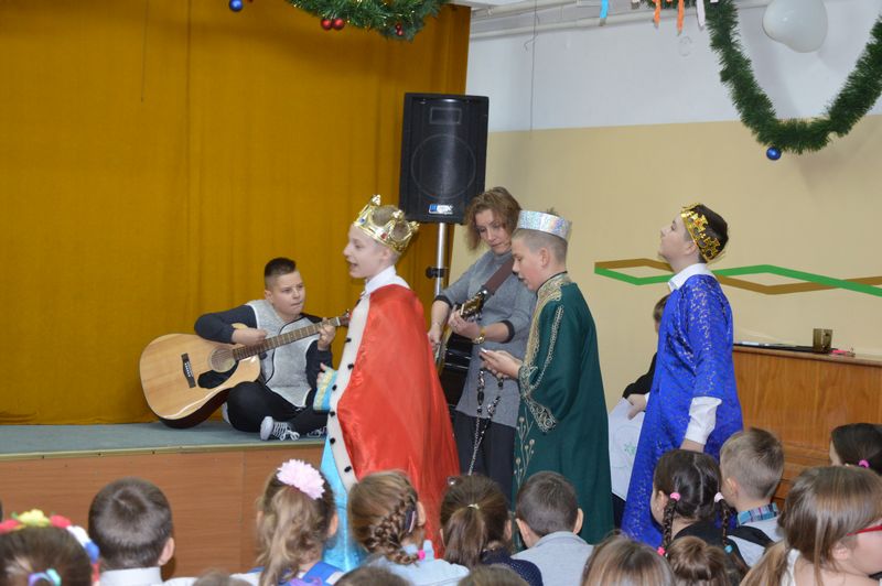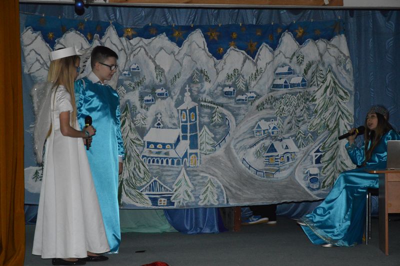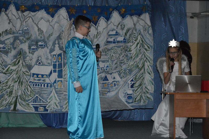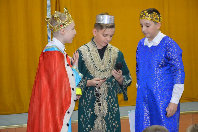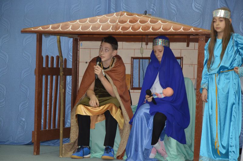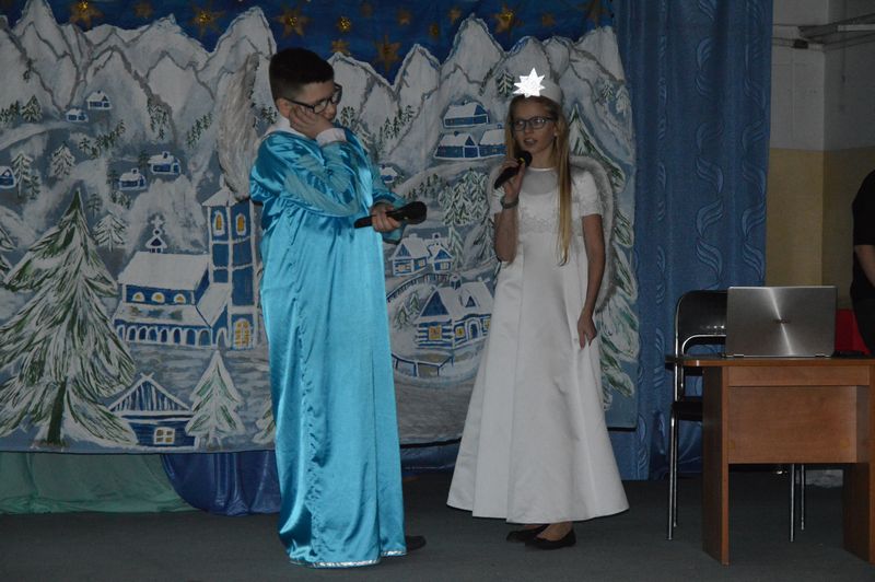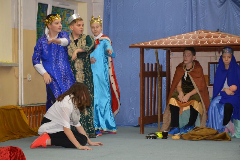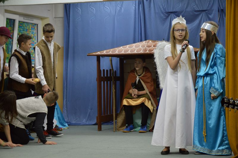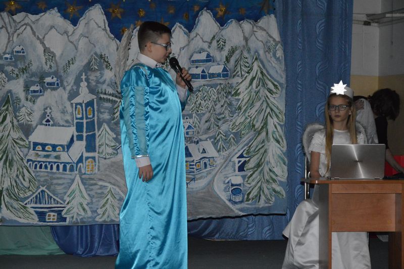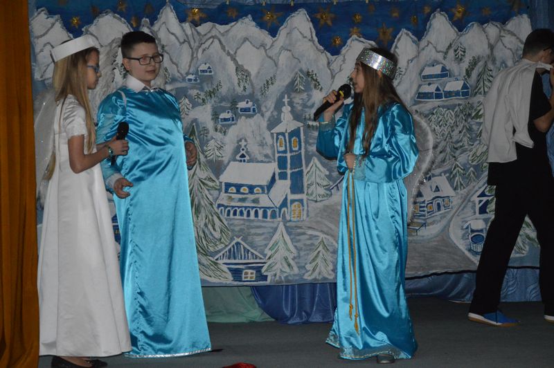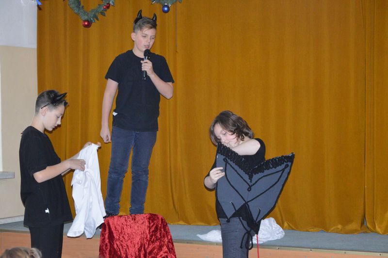 W świąteczną atmosferę wprowadzili nas uczniowie z klasy VI a, którzy przygotowali dla nas przedstawienie jasełkowe. Ucznioiwe na wesoło, z przymrużeniem oka pokazali wydarzenia z przed 2 tysięcy lat, historię dzieciątka Jezus, Maryi i Józefa. Nie zabrakło także diabełków, pastuszków, anioła i Trzech Króli. Część artystyczna została wzbogacona śpiewaniem kolęd i pastorałek. Na koniec Pani Dyrektor- Magdalena Hyla złożyła wszystkim zebranym życzenia bożonarodzeniowe oraz życzyła bezpiecznego wypoczynku. Następnie uczniowie udali się do klas na uroczyste wigilie klasowe.