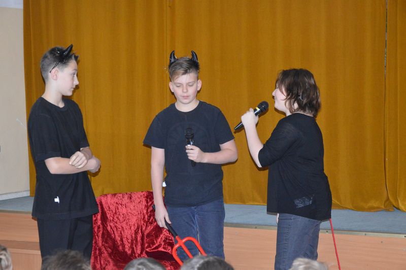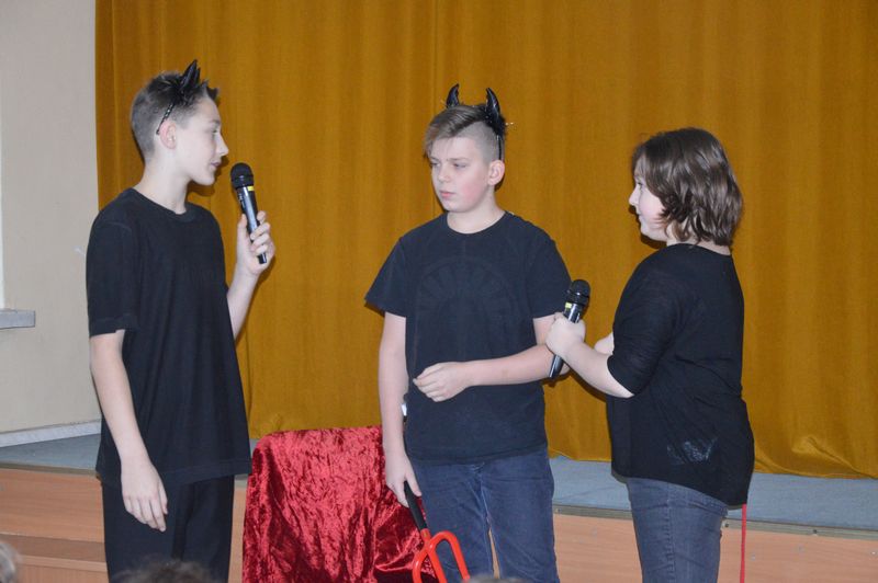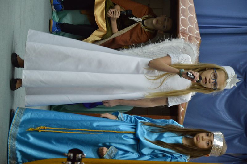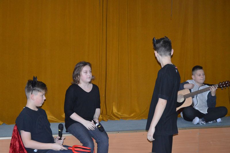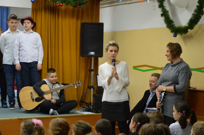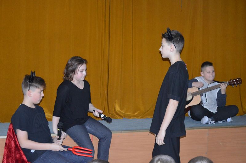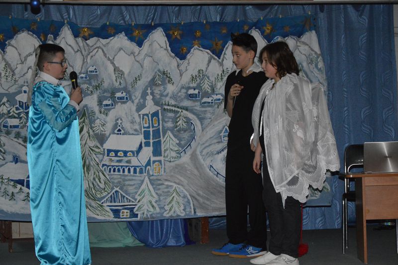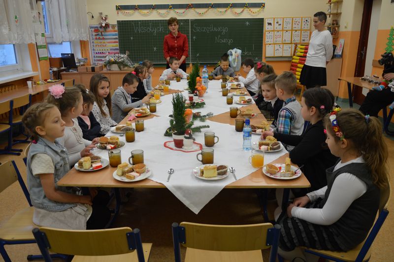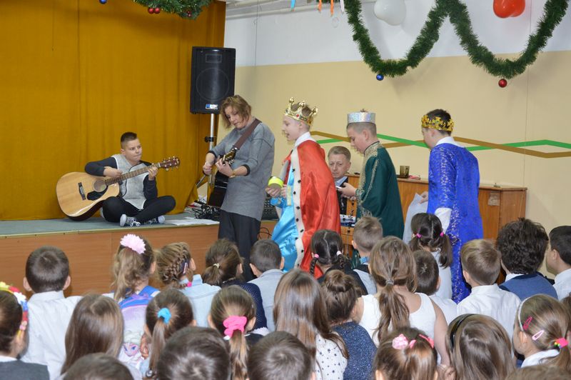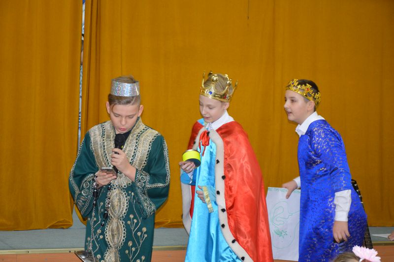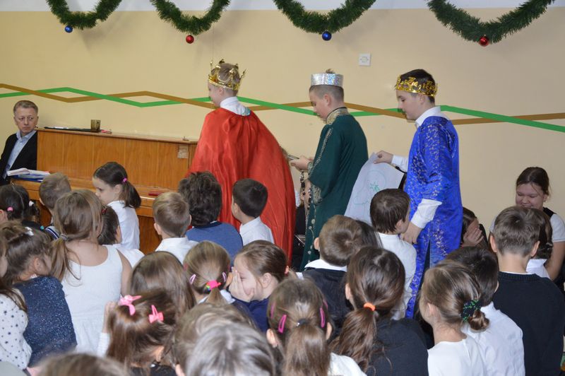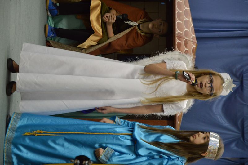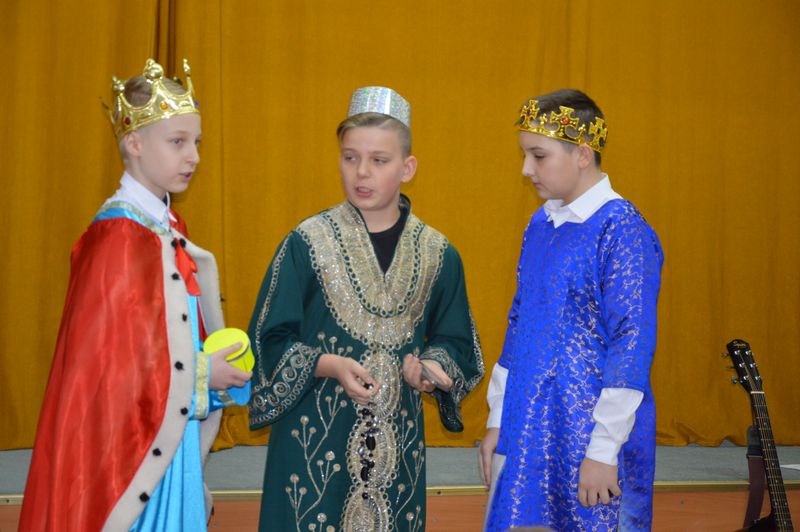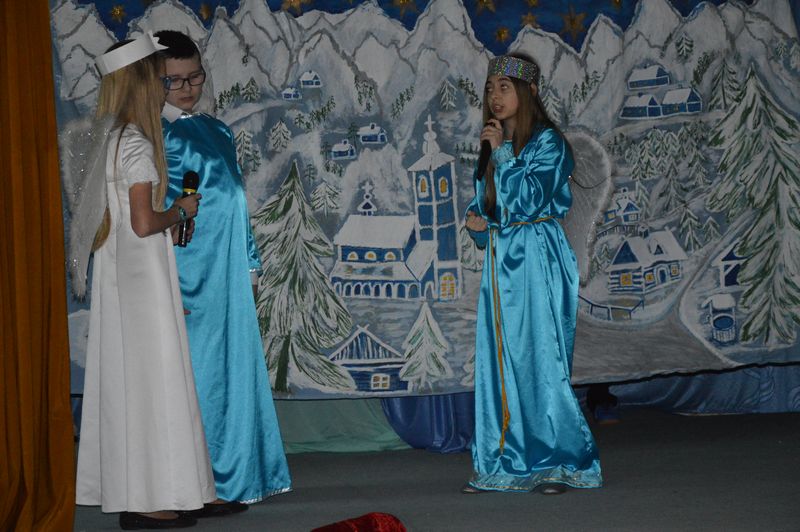 W świąteczną atmosferę wprowadzili nas uczniowie z klasy VI a, którzy przygotowali dla nas przedstawienie jasełkowe. Ucznioiwe na wesoło, z przymrużeniem oka pokazali wydarzenia z przed 2 tysięcy lat, historię dzieciątka Jezus, Maryi i Józefa. Nie zabrakło także diabełków, pastuszków, anioła i Trzech Króli. Część artystyczna została wzbogacona śpiewaniem kolęd i pastorałek. Na koniec Pani Dyrektor- Magdalena Hyla złożyła wszystkim zebranym życzenia bożonarodzeniowe oraz życzyła bezpiecznego wypoczynku. Następnie uczniowie udali się do klas na uroczyste wigilie klasowe.