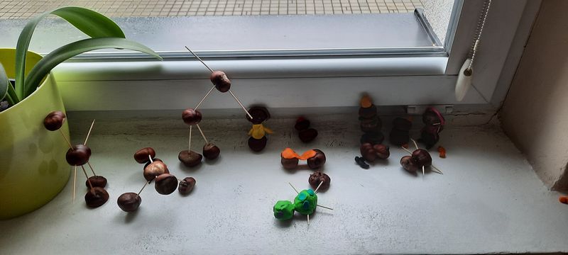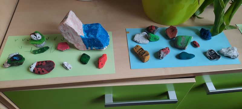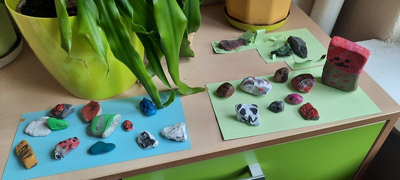 Wyróżnienia otrzymały:sala 12 (kl.2 A) i sala 23 (kl. 6A) za ciekawe wykonanie zwierzątek z kamyków oraz bukietów kwiatów i liści na drewnianych pniach.