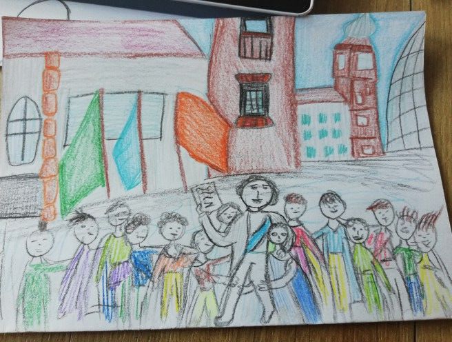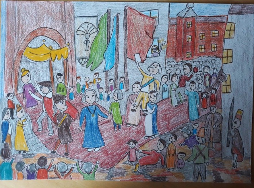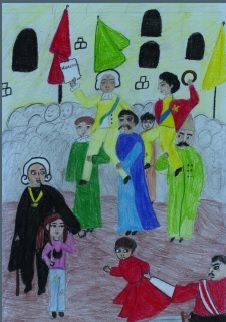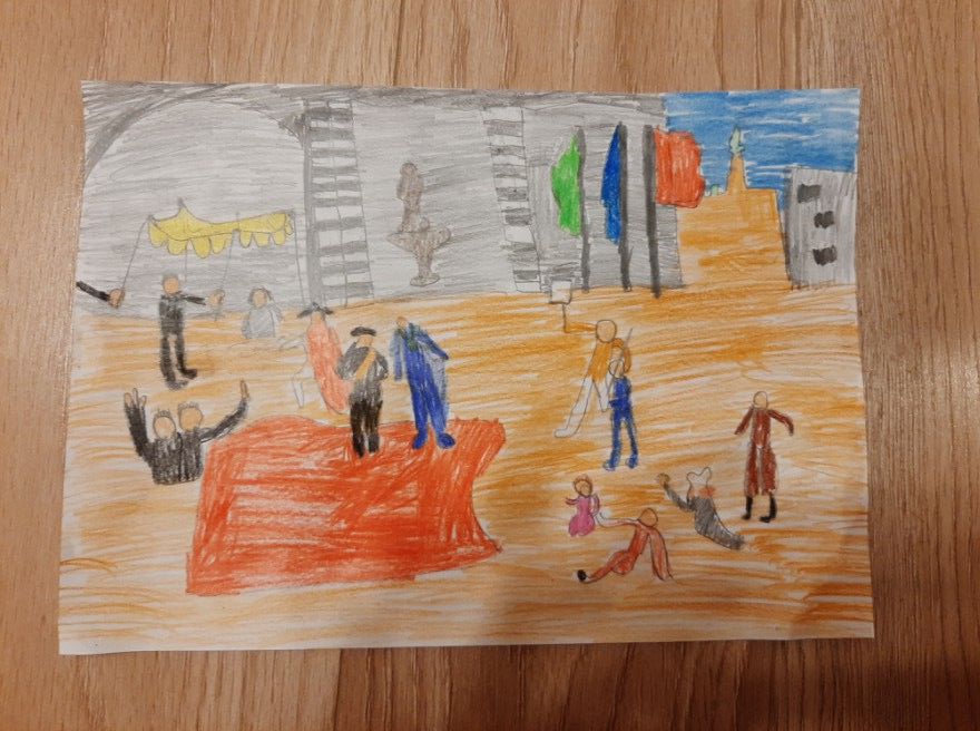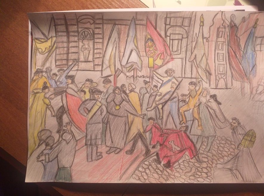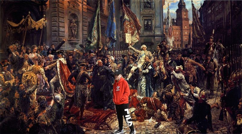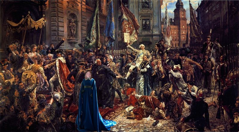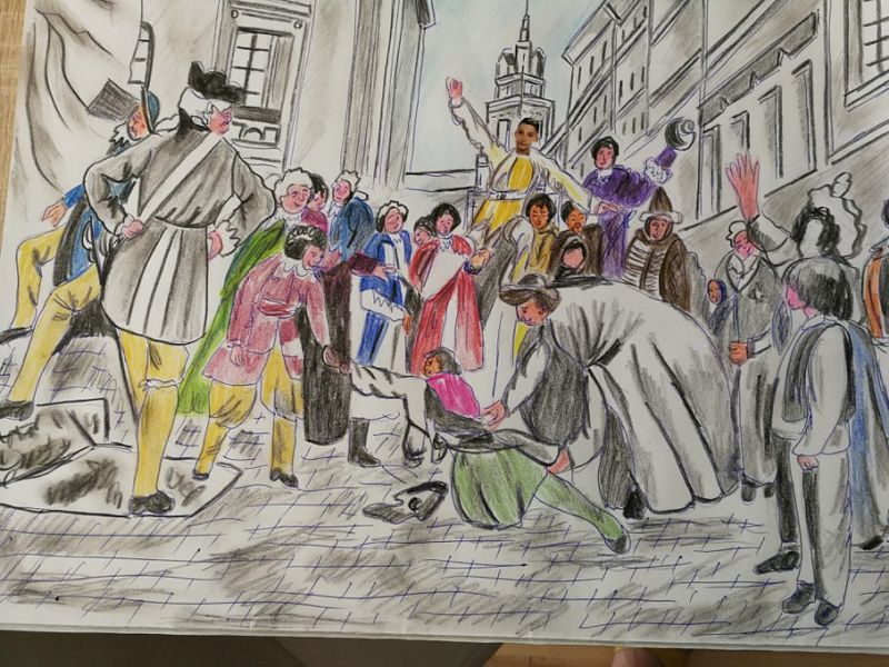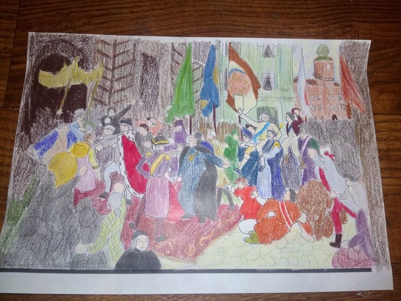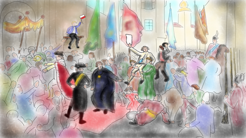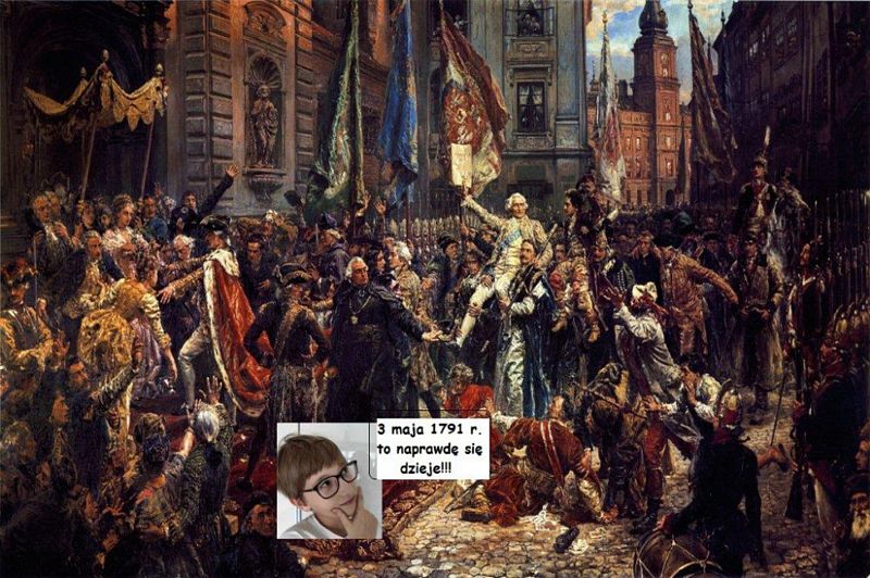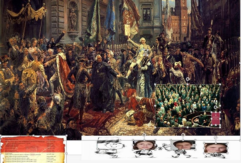 Proszę Państwa, co się tutaj dzieje? Jaka wrzawa! Jakie okrzyki! Jaki tłum! W drzwiach kolegiaty sam miłościwie panujący król Stanisław August Poniatowski. Spójrzcie proszę na prawo na ramionach posłów niesiony jest sam Marszałek Sejmu Wielkiego Stanisław Małachowski. W ręku dzierży Konstytucję! Za Marszałkiem dostrzec możemy twarz wielkiego patrioty Tadeusza Kościuszki. Wszystkie stany wyległy dziś na ulice. Dostojnicy kościoła z Hugo Kołłątajem i Stanisławem Staszicem na czele. Ale cóż to? Są i tacy, którzy przybyli na koniu – to nasz książę Józef Poniatowski. Ile znajomych twarzy poparzcie to przecież nasz Maciek się zadumał, a Mateusz krzyczy ile sił w płucach ,, Wiwat! Wiwat! Niech żyje król!” Gdzieś przed chwilą przechodził tu Patryk. Ulegamy nastrojowi fety, radości i narodowego szaleństwa… a kto jeszcze tu był i z nami świętował zobaczcie sami.