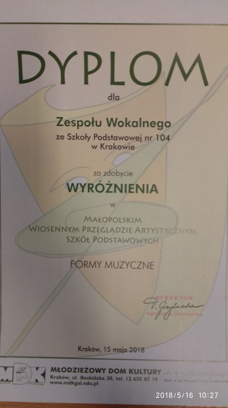 Zespól wokalny zdobył wyróżnienie w Małopolskim Wiosennym Przeglądzie Artystycznym Szkół Podstawowych zorganizowanym przez MDK im. I.K.Gałczyńskiego w Krakowie. W składzie zespołu wystąpiły uczennice klasy 4b: