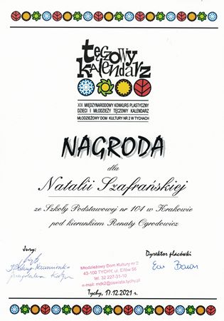 21 Gru 2021 NAGRODA dla uczennicy naszej szkoły w XIX Miedzynarodowym Konkursie Plastycznym"Tęczowy kalendarz" Wydarzenia / Aktualności Natalia Szafrańska z klasy 6a zdobyła NAGRODĘ w XIX Miedzynarodowym Konkursie Plastycznym Dzieci i Młodzieży p..: "Tęczowy kalendarz" zorganizowananym przez MDK w Tychach. GRATULUJEMY!