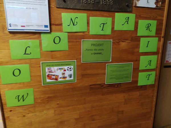 Szkolne Koło Wolontariatu włączyło się do pomocy dla szkoły w Ghanie - szkoła prowadzona jest przez Siostry Nazaretanki. Chętni uczniowie IV – VIII zakupili dla swoich afrykańskich rówieśników piłki do gry w piłkę nożną i siatkową, piłkę do skakania, klocki-wafle, maty edukacyjne, kredki. Była to nasza druga organizowana akcja na rzecz szkoły w Ghanie – w poprzednim roku szkolnym zbieraliśmy przybory szkolne. Wszystkim ofiarodawcom, oraz wszystkim zaangażowanym bardzo dziękujemy za pomoc.