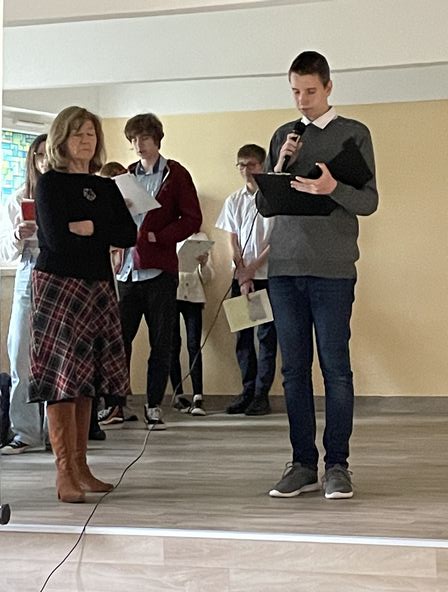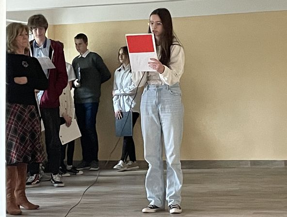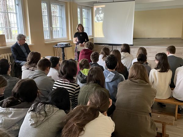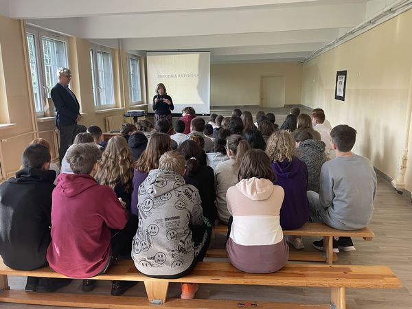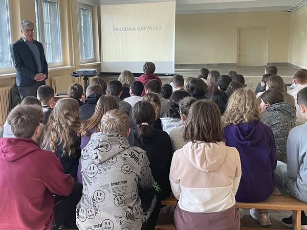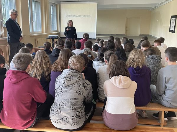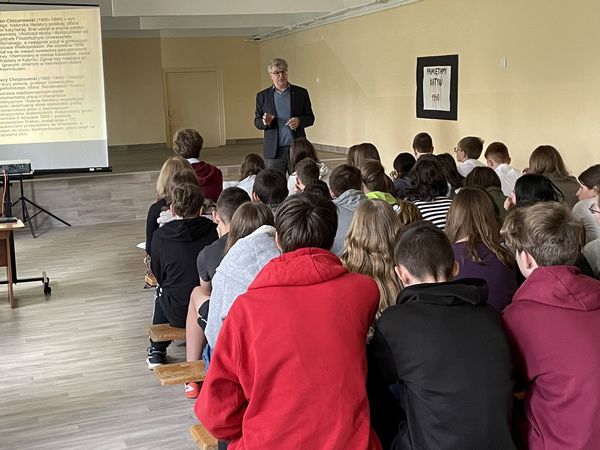27 kwietnia 7 i 8 klasy wzięły udział w prelekcji "Pamiętamy Katyń 1940" wygłoszonej przez dr Dariusza Gorajczyka przedstawiciela Instytutu Pamięci Narodowej. Uczniowie po zakończeniu prezentacji czytali fragmenty listów dzieci do swoich ojców, którzy zginęli w Katyniu.