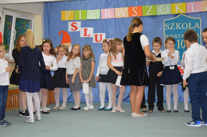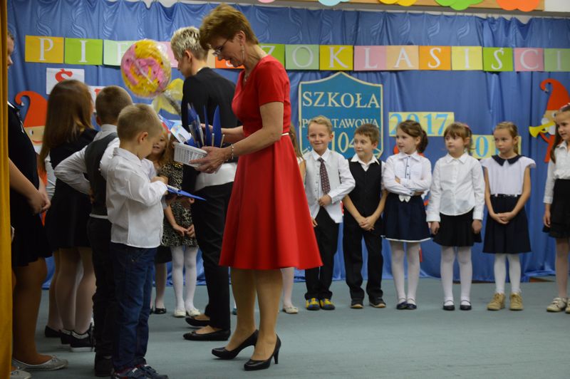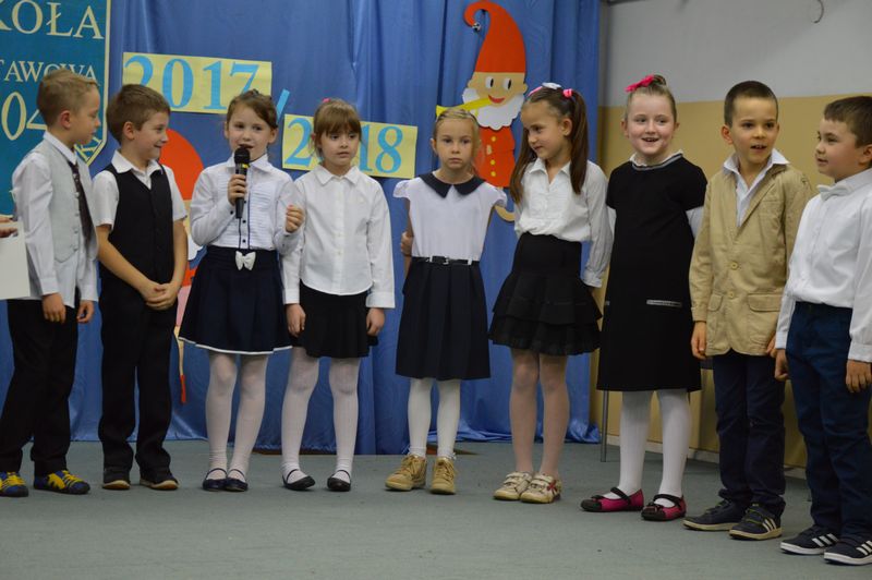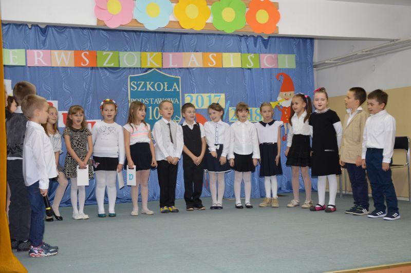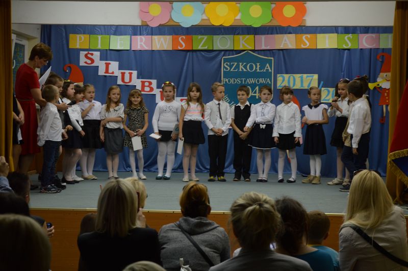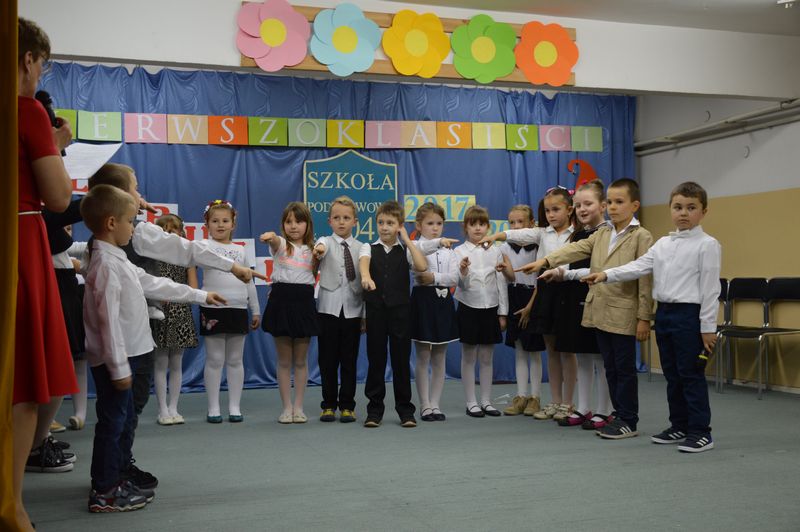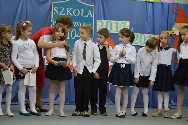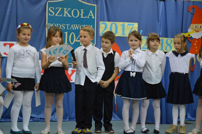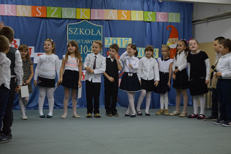 W niezwykle podniosłej atmosferze, przed pocztem sztandarowym, pierwszacy ślubowali być dobrymi uczniami i Polakami, przyjaciółmi roślin i zwierząt, swym zachowaniem i nauką sprawiać radość rodzicom i nauczycielom. Po złożeniu ślubowania pani dyrektor Magdalena Hyla dokonała symbolicznego pasowania na ucznia wypowiadając zdanie: „Pasuję Cię na ucznia Szkoły Podstawowej nr 104 " dotykając ogromnym, kolorowym lizakiem ramion pierwszoklasistów. Uczniowie otrzymali od wychowawczyni pamiątkowe zdjęcia i pióra. Następnie udali się na słodki poczęstunek przygotowany przez rodziców.