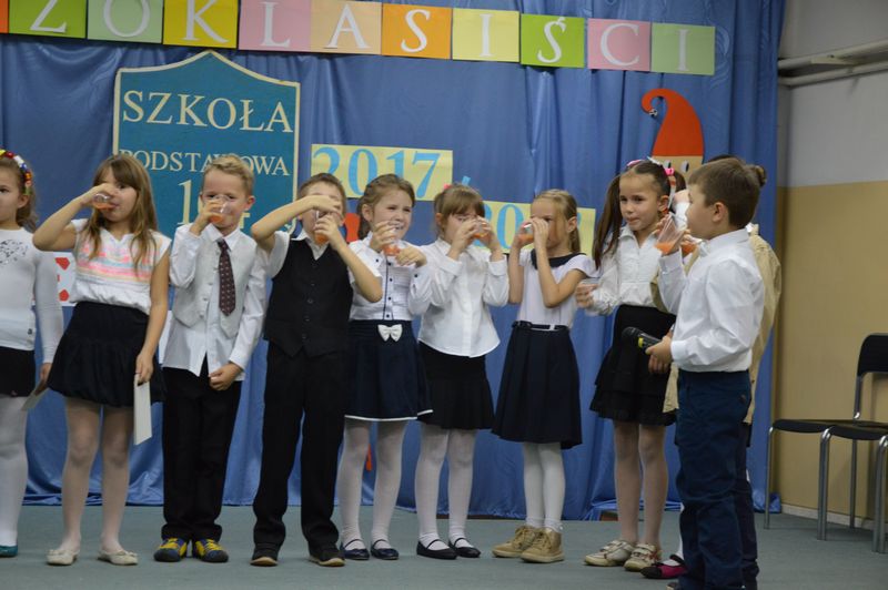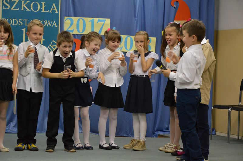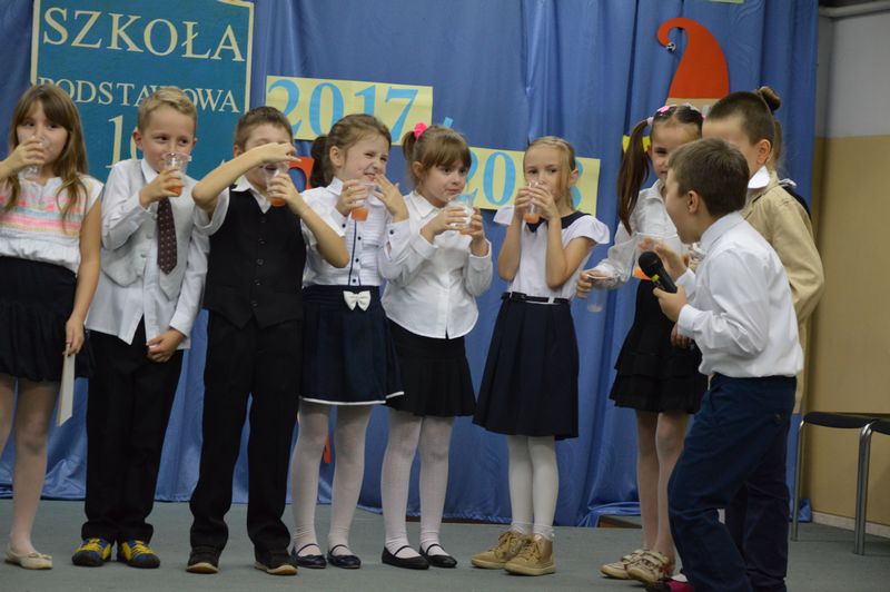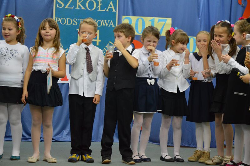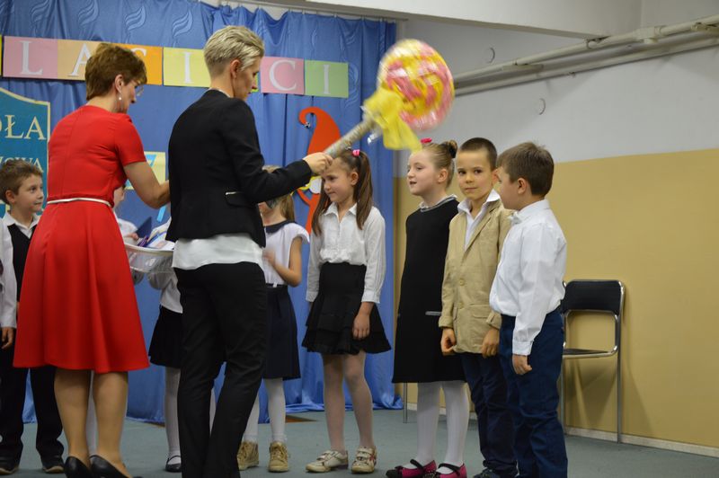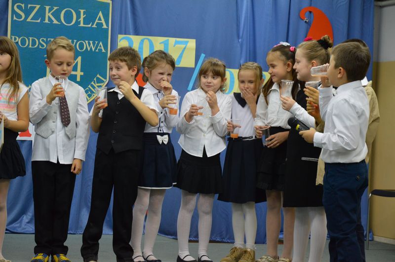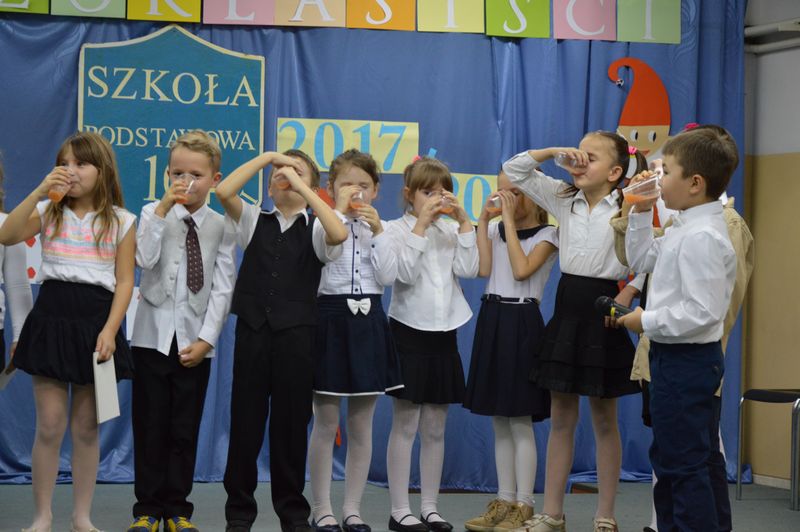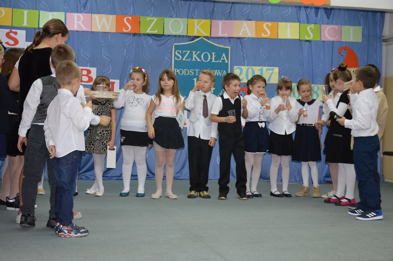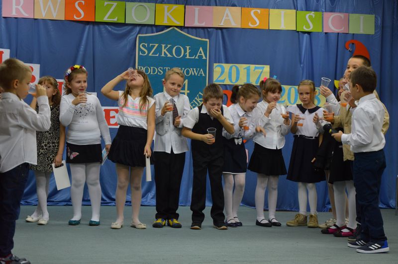 Zanim jednak maluchy zostały przyjęte do grona społeczności szkolnej musiały przedstawić to, czego już się w szkole nauczyły. Gotowi, odświętnie ubrani i bardzo przejęci przystąpili do zaprezentowania swoich umiejętności. Zadaniem uczniów było m.in. zaśpiewanie piosenek, recytacja wierszy oraz udzielenie odpowiedzi na szereg bardzo ważnych pytań i zagadek oraz zadanie najtrudniejsze - wypicie niezwykle kwaśnego napoju z uśmiechem na twarzy:)