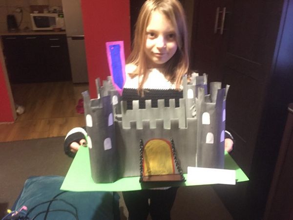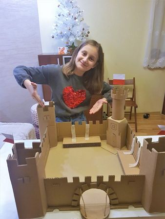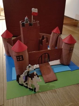 Szkolny korytarz dziś pusty i nie słychać głośnych rozmów, nikt nie psoci podczas szkolnych przerw. Nikt nas nauczycieli nie pyta czy będzie kartkówka. Trwa zdalne nauczanie i szkoła przeniosła się do naszych domów. W zaciszu swoich domów uczniowie klasy czwartej wykonali makiety zamków. Powstały zamki z tektury, papieru, klocków, klocków lego. Prace zostały pomysłowo wykończone. W swoich pracach próbowali odtworzyć charakterystyczne elementy budowy zamków z tamtej epoki tj. grube mury, małe okienka, dziedziniec, wieże, baszty, fortyfikacje. Nam oglądającym nie pozostaje nic innego jak oczyma wyobraźni przenieść się na jakiś średniowieczny turniej.