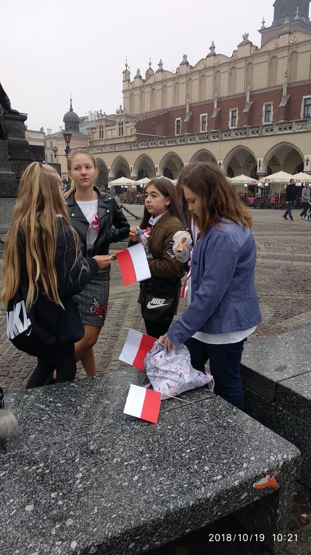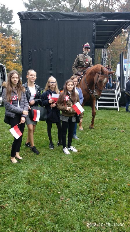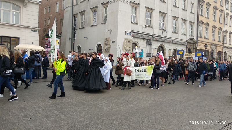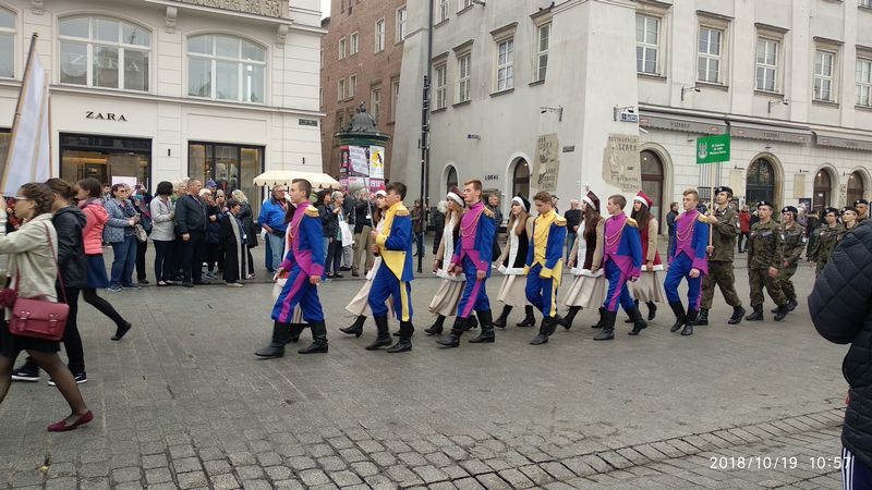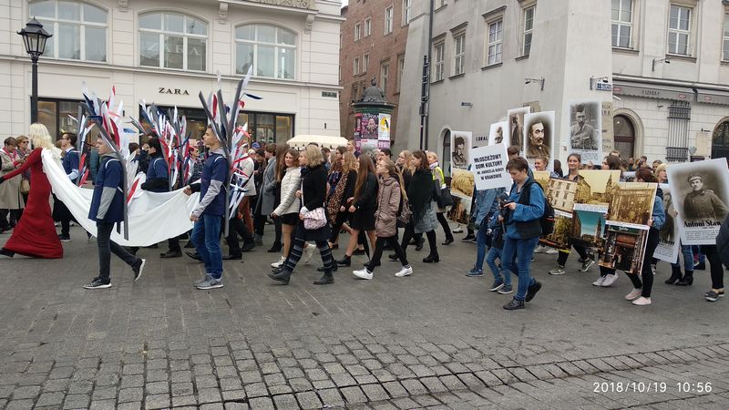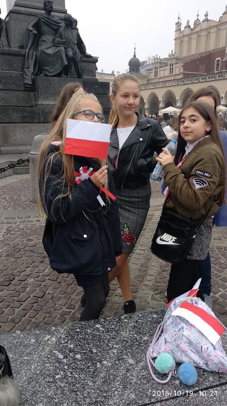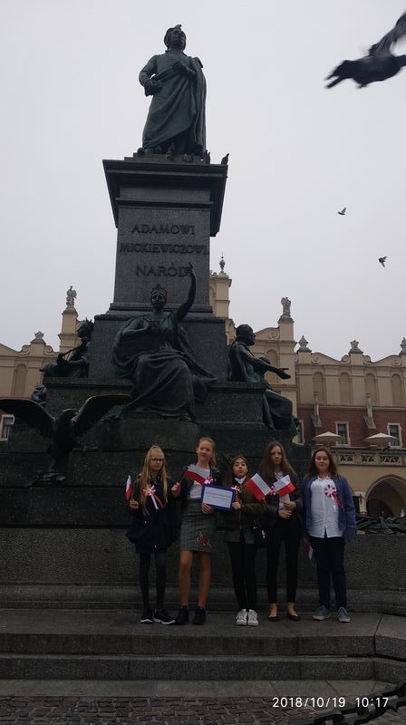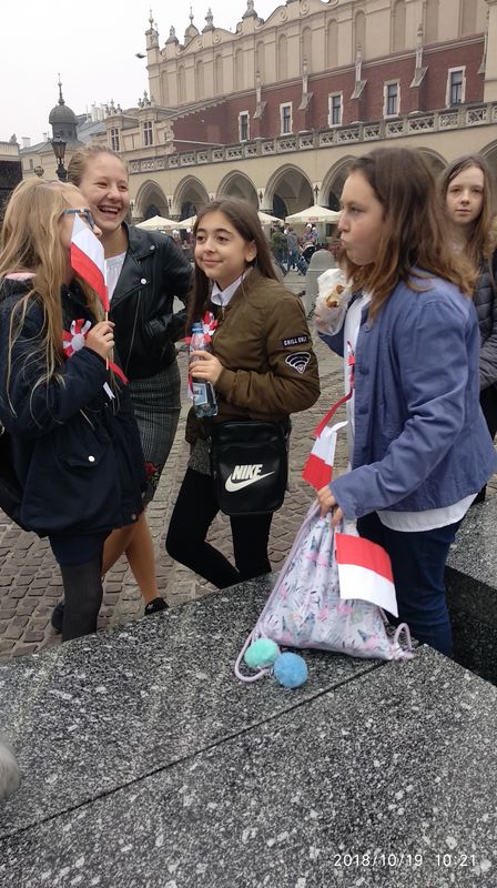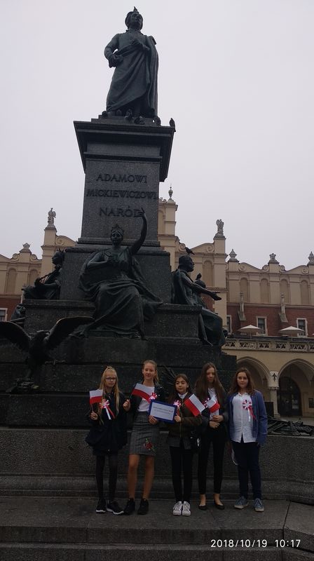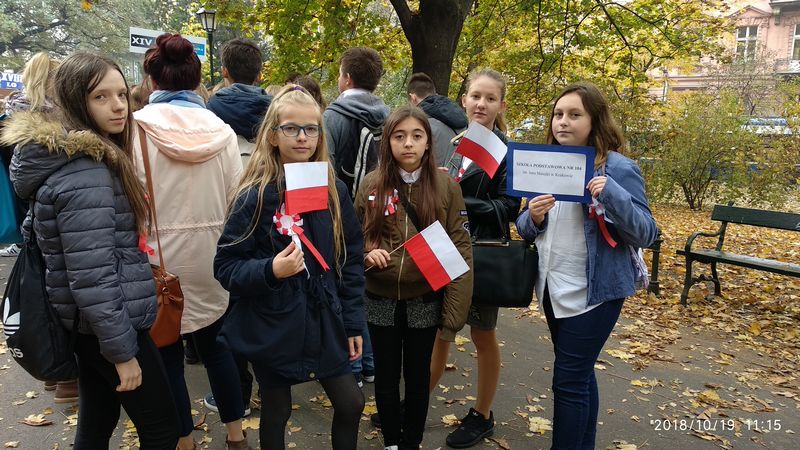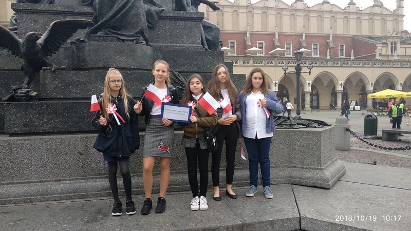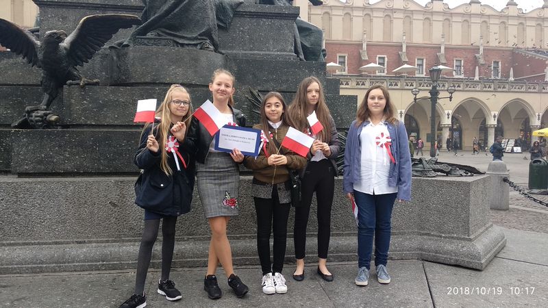 Dnia 19 października 2018r. odbyło się Widowisko Dumy i Radości. Aby uczcić 100 rocznicę odzyskania przez Polskę niepodległości do Krakowa przyjechało 10 tysięcy uczniów z różnych zakątków małopolski. Część z nich przybyła na uroczystość poprzebierana w stroje z epoki, z regionu. Nieśli sztandary szkół, proporce i tablice z napisami, za co kochają Polskę. Widowisko rozpoczęło się Mszą Św. w Katedrze Wawelskiej. Marsz rozpoczął się na Wzgórzu Wawelskim po Mszy Św. Rozpoczął go Jeździec Pamięci - jadący konno Pan Włodzimierz "Wowa" Brodecki. Ze Wzgórza Wawelskiego marsz kierował się do zejścia w stronę ulicy Bernardyńskiej, następnie ulicą Grodzką, Rynkiem Głównym, ulicą Szewską, ulicą Piłsudskiego do Parku Jordana. W Parku Jordana można było porozmawiać z Żołnierzami Niezłomnymi, odwiedzić stoiska sponsorów, odbył się również poczęstunek. Naszą szkołę reprezentowały i dzielnie maszerowały uczennice klasy VIIa: Izabela Chowaniec, Patrycja Dziedzic, Karolina Godula, Weronika Hamera i Oliwia Orlewicz.